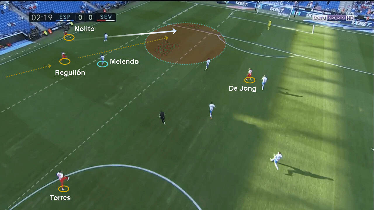 From the start we saw Sevilla on the front foot taking control of possession, exploiting width and controlling the centre of the pitch with their midfield rotations. De Jong would occupy the Espanyol central defenders as a traditional lone striker. On the right side, Ocampos would lead the attack by occupying the inside corridor or right half-space. This made room for the captain, Jesús Navas to use his pace and overlap, seeking de Jong with an early cross.