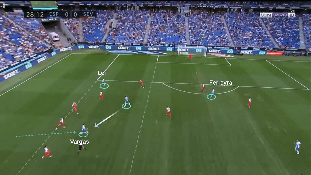 Espanyol looking to attack inside channels through Vargas. This attempt led to a shot on target that was parried by Vaclík. But we see no players attacking the wide areas to give options.