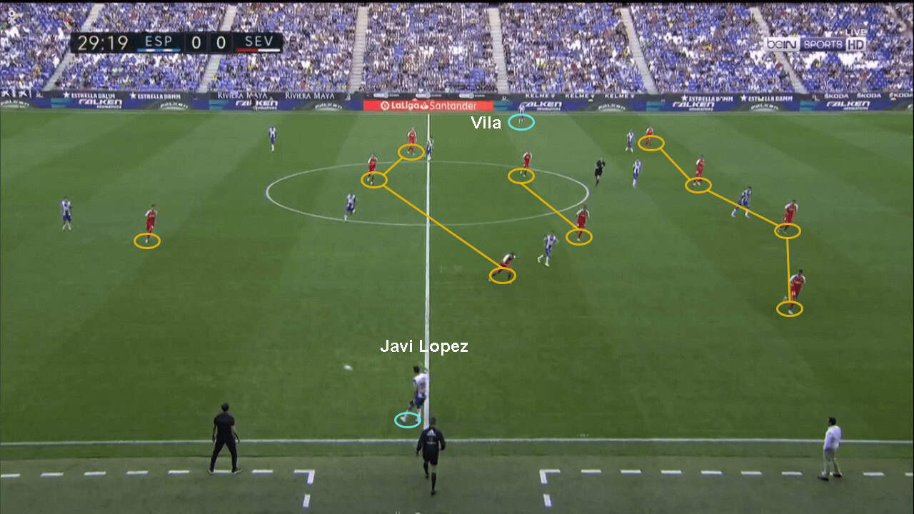 Espanyol began the game passively, sitting in a low block with an attempt to close down the spaces that Sevilla looked to dissect with their dynamic positional play. The crosses from the right were well defended, and having the captain, Javi López, on the right help take charge of the dual-threat of Nolito and Reguilón.