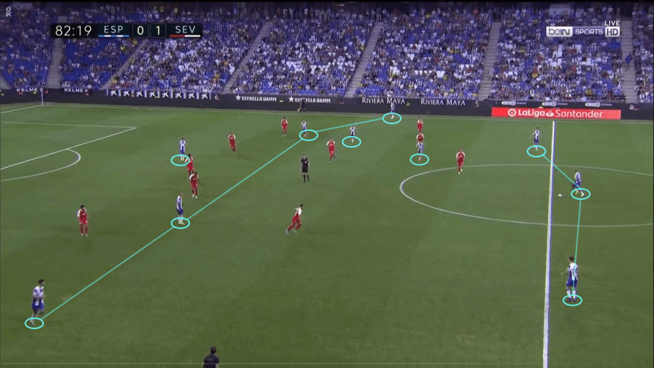 In the 80th minute, Espanyol switched to a three-man defence with more width in their team shape with the 3-2-4-1. They just started to test Sevilla before conceding a second goal.