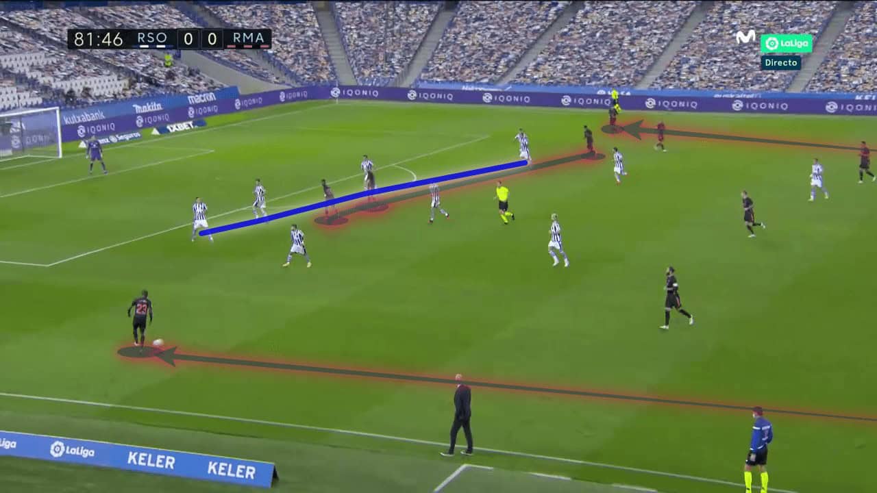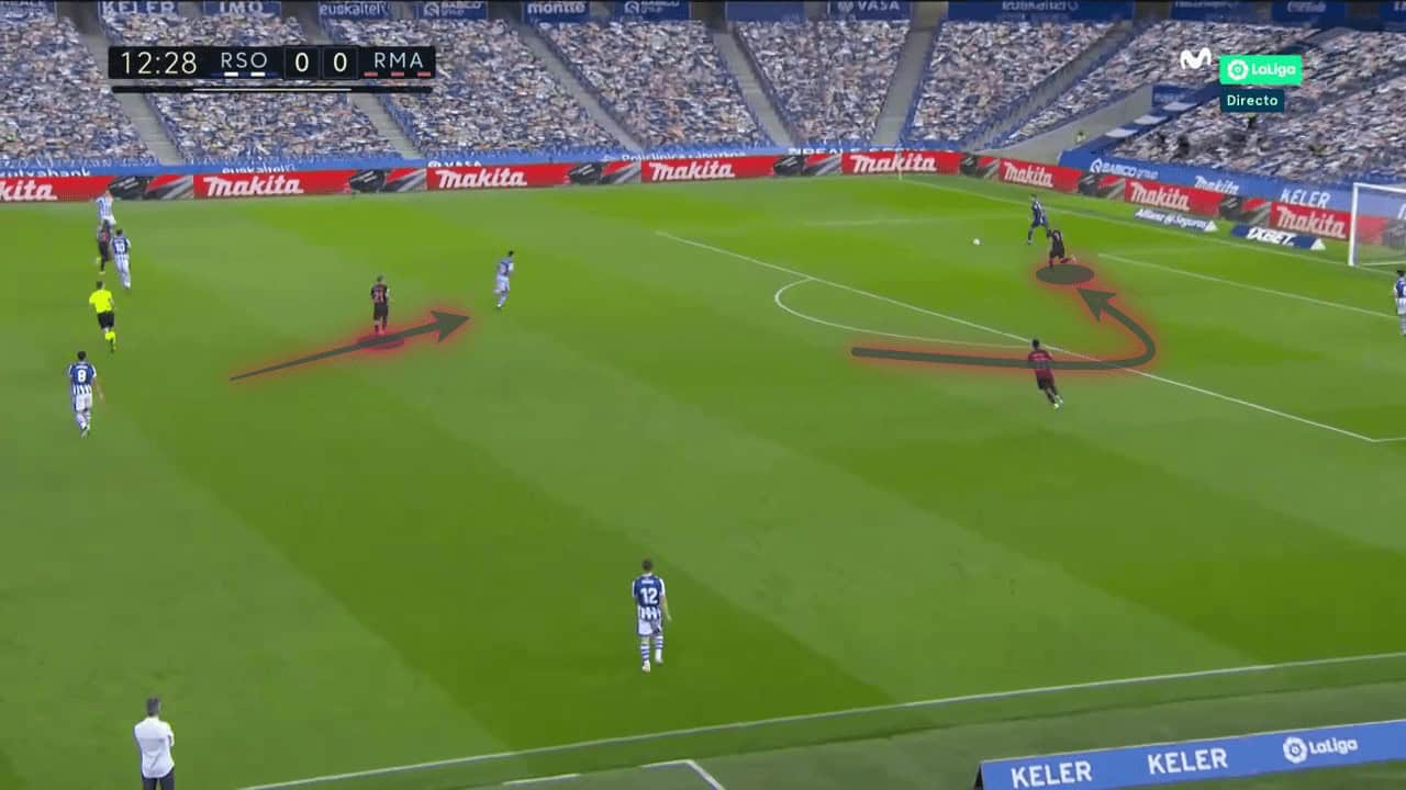 Real Sociedad are a naturally very narrow side, their wide forwards tend to drift centrally. That opens up space down the flanks, particularly for opposition full-backs and that was where Dani Carvajal and Mendy could get forward, as shown above. They were dangerous with this approach and could operate in half-spaces and then push on to overlap with Vinícius and Rodrygo offering a wide threat, but also able to drift inside to support Benzema.