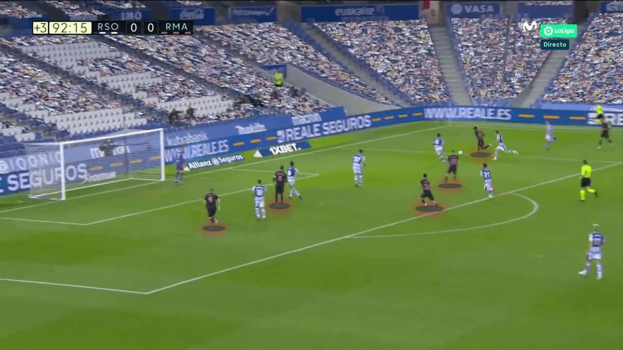 However, late on in the game, his critics found their explanation. In the final few minutes, Real Madrid overloaded the box and had plenty of players in central areas, with Ramos even stepping up into attack in his usual role of target man striker in emergencies. This will, of course, have opened Zidane up to questions. Is Ramos a preferable option to Jović in attack? While his aerial ability may give him the nod, with five substitutions available, it does seem a questionable call to bring on a young debutant in injury time when chasing a game if they are to play out wide against Real Sociedad, who were playing in a very low block by this stage. Even fresh legs and pace would not be impactful against a side sat deep. Instead, more of a central presence from earlier on in the tie, or a natural finisher in the box, could have been more powerful.