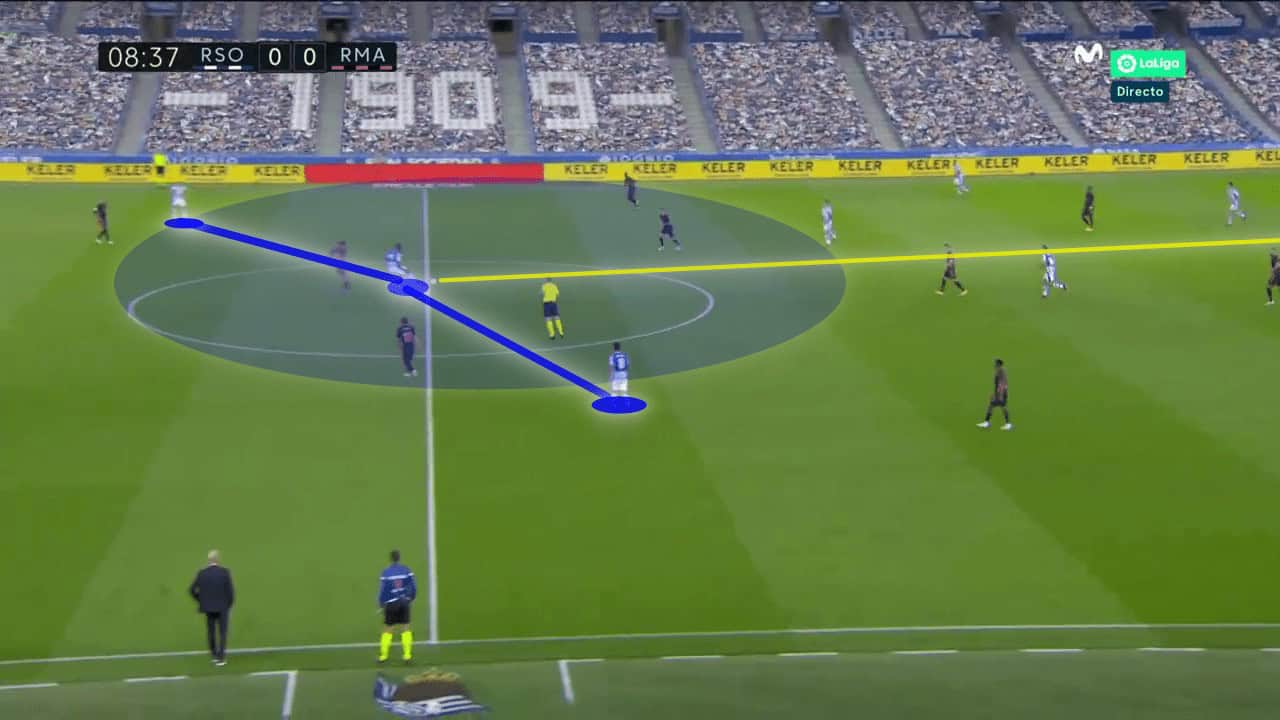 As can be seen in this example, goalkeeper Álex Remiro was left with only one choice, to play a long flat ball through to Isak in order to evade pressure from Real Madrid’s forwards, as touched upon previously. However, when Isak receives the ball he has no open passing channels directly ahead of him and his positioning is far from ideal, with his back to both passing options, meaning that he would have to take at least two touches to be able to turn and play a pass comfortably. With Varane pressing him from behind, that was always going to be a difficult task. In the end, he resorted to playing the ball straight out of play.