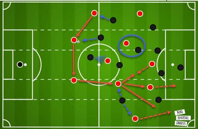 Notice in the example above how that often looked on the pitch. In this instance, Óliver Torres has possession of the ball on the left, lays it off to his backline, and then shifts over to the other side of the pitch to receive it once again in a pocket of space.