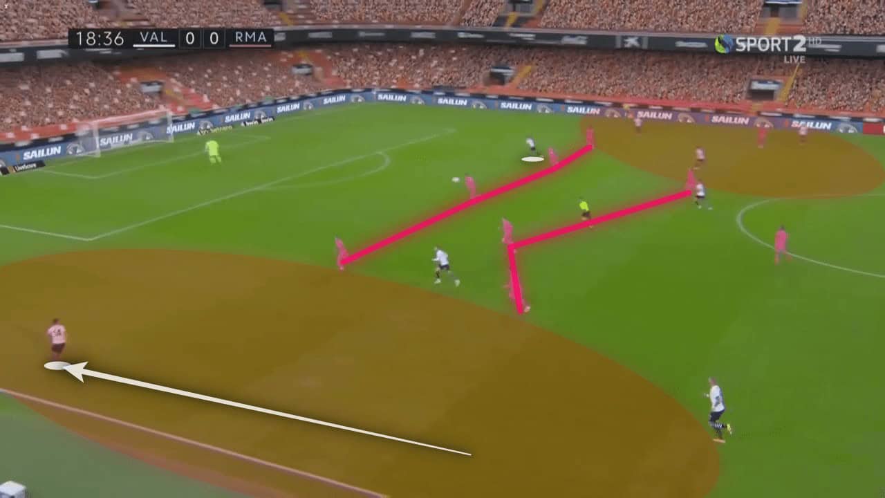 Boosted by Musah’s pace down the right and knowing that Vinícius would not track back as much as would be required to limit this threat, Valencia could catch Real Madrid dangerously on the counter. With threats now coming down both flanks, the Real Madrid defence became incredibly stretched with spaces opening up between the positions in the backline and without the protection of Casemiro to drop in and fill the gap. Casemiro’s absence was sorely felt and Valencia looked to take advantage with a superb strategy which was very well implemented.