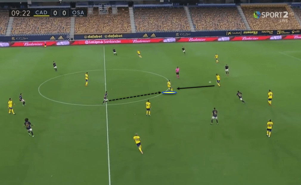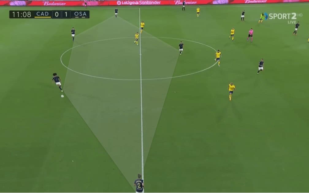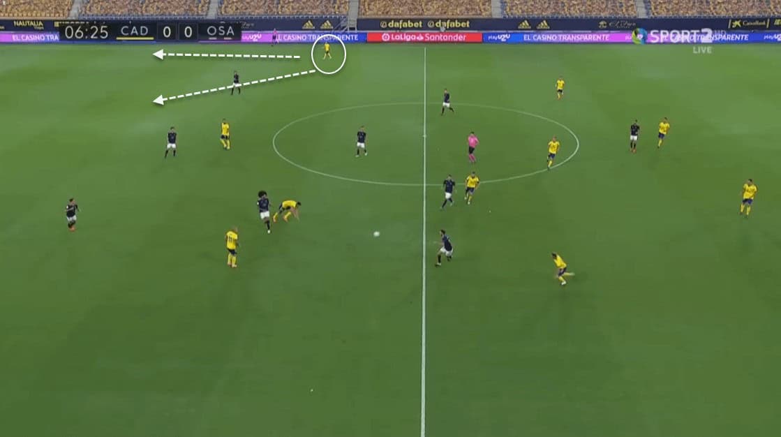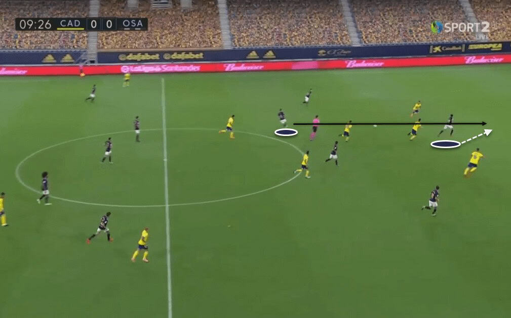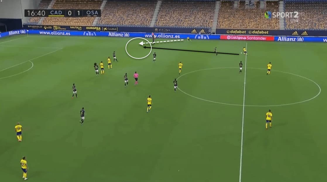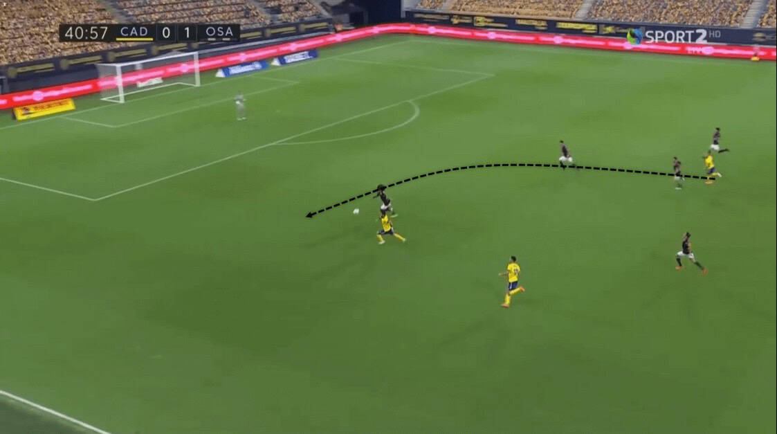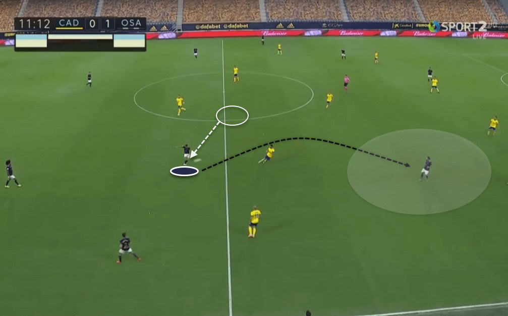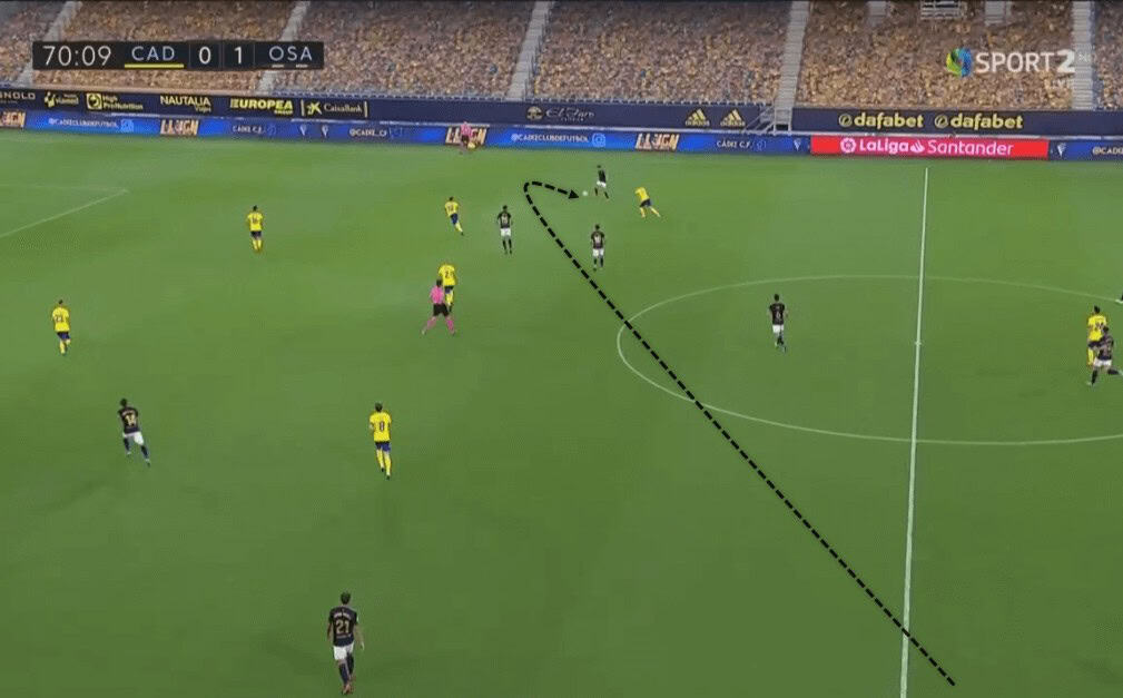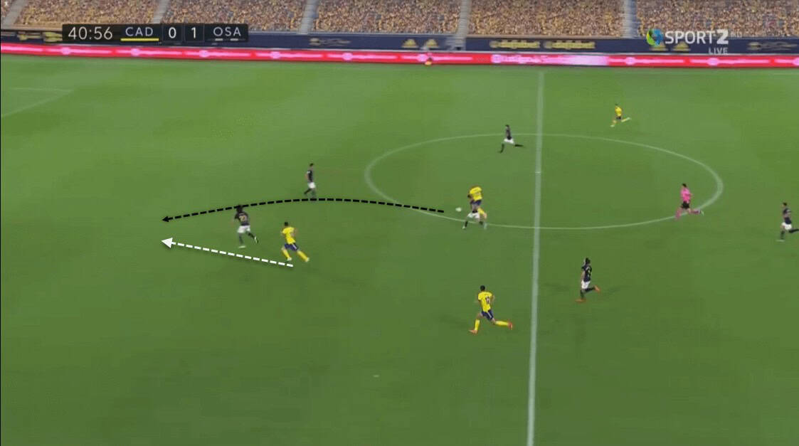 While this was one approach of creating spaces, Osasuna’s players were always using their body positioning to put themselves in spaces. This allowed Osasuna to have free men all around the pitch, occasionally allowing them to switch play and not fall into Cádiz’s overload towards the ball.