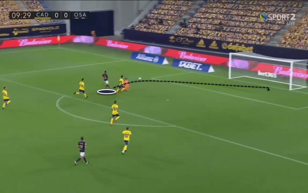 The pass is poorly executed, and instead of aiming a shot on goal, Negredo is forced to wait for his teammates to arrive inside the box to deploy a cross. Since Cádiz were not flexible enough to try alternative approaches to feed the target man, instances like these kept happening. As a result, despite having an xG of 0.52, more than that of Osasuna, Cádiz were unable to use their strength up front.