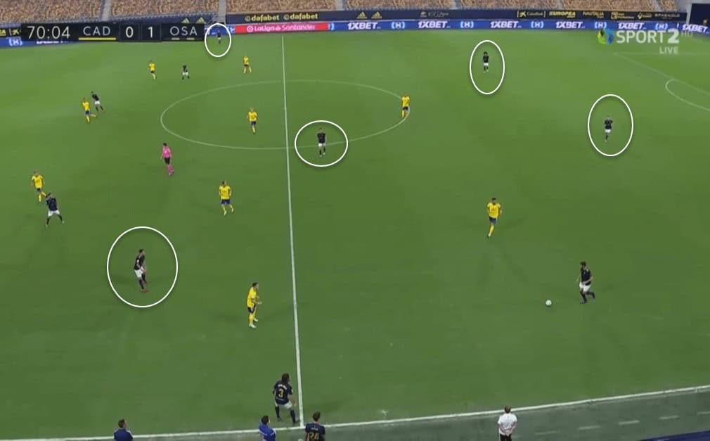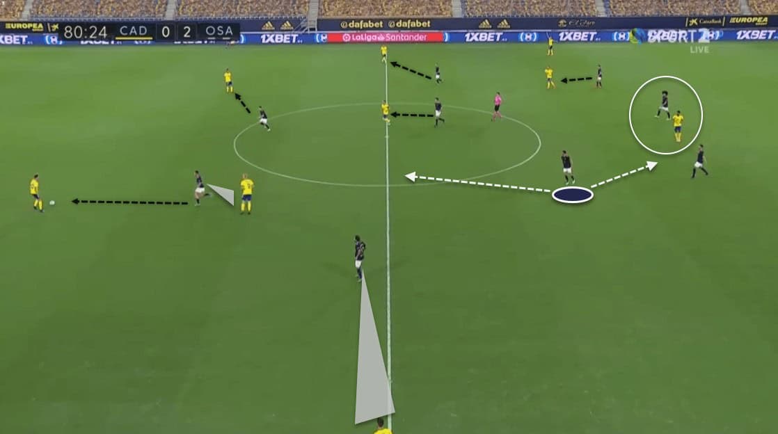 Like this instance shows, Osasuna players placed themselves between the Cádiz markers, and their constant movement allowed them to have an edge over the opposition. We can clearly see Cádiz intending to create an overhaul towards the ball here as well, and by inviting them to do so, the player on the ball is intending to play towards the other side to find space and catch Cádiz on the left side.