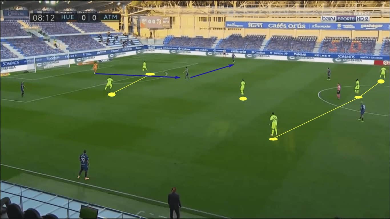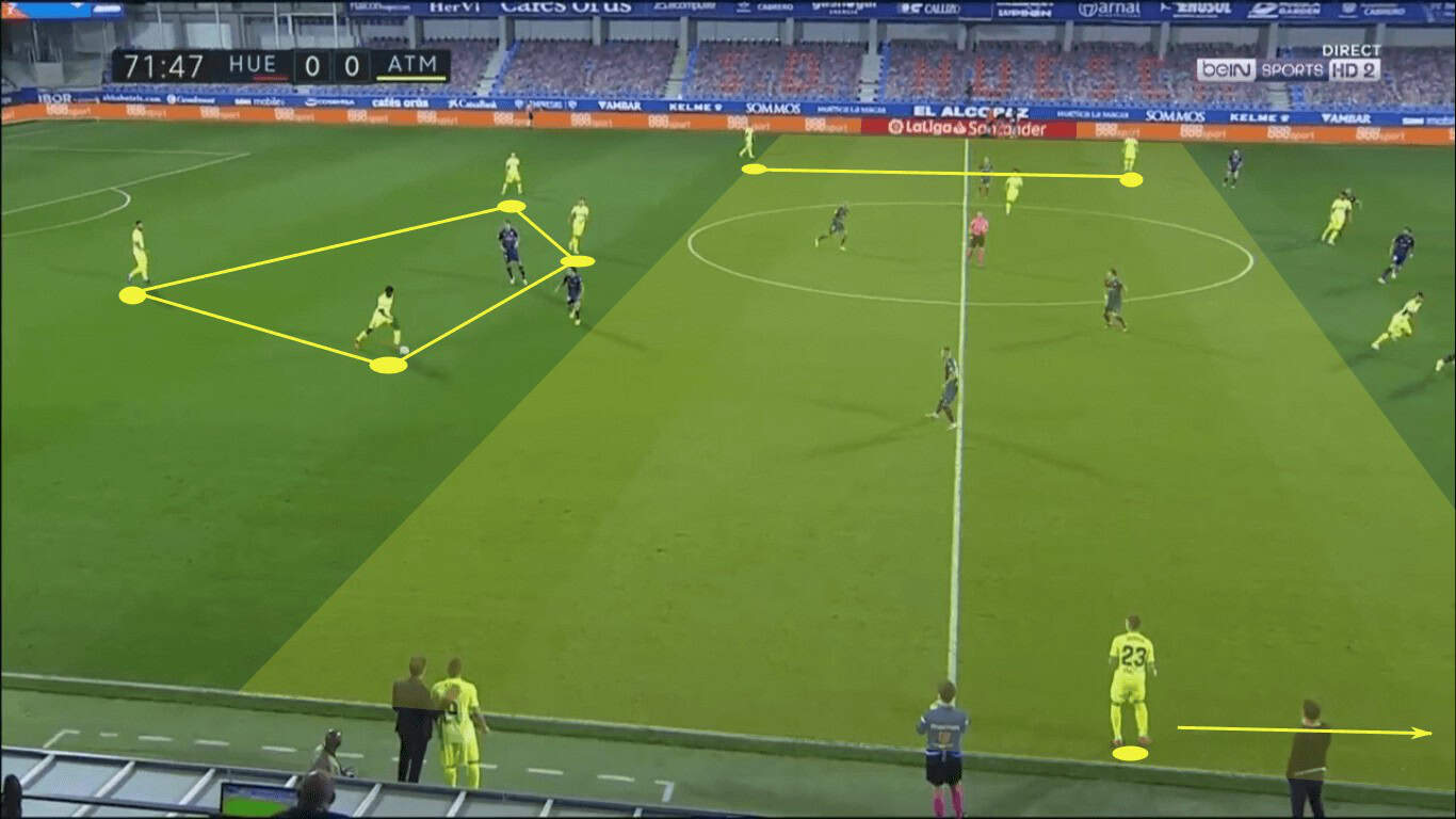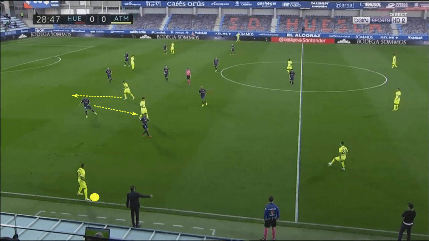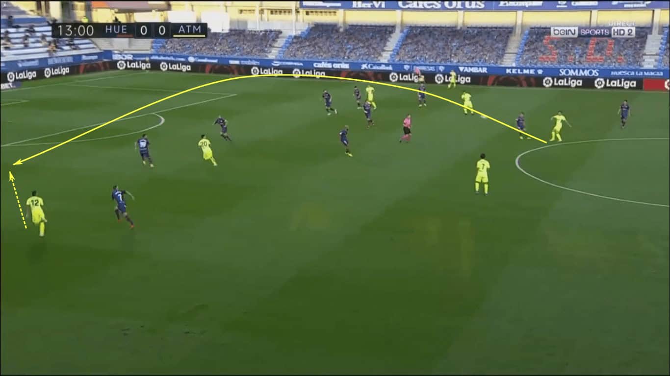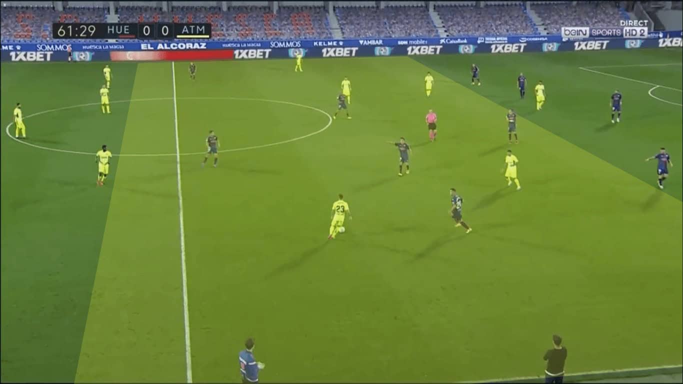 In the later stages of the game, Atléti had more success getting around the Huesca low block and sending dangerous deliveries into the box. Diversifying the attack sooner would surely have kept the opponent off-balance. With Atlético so heavily concentrated in the centre, greater creativity and production in the wings was necessary.
