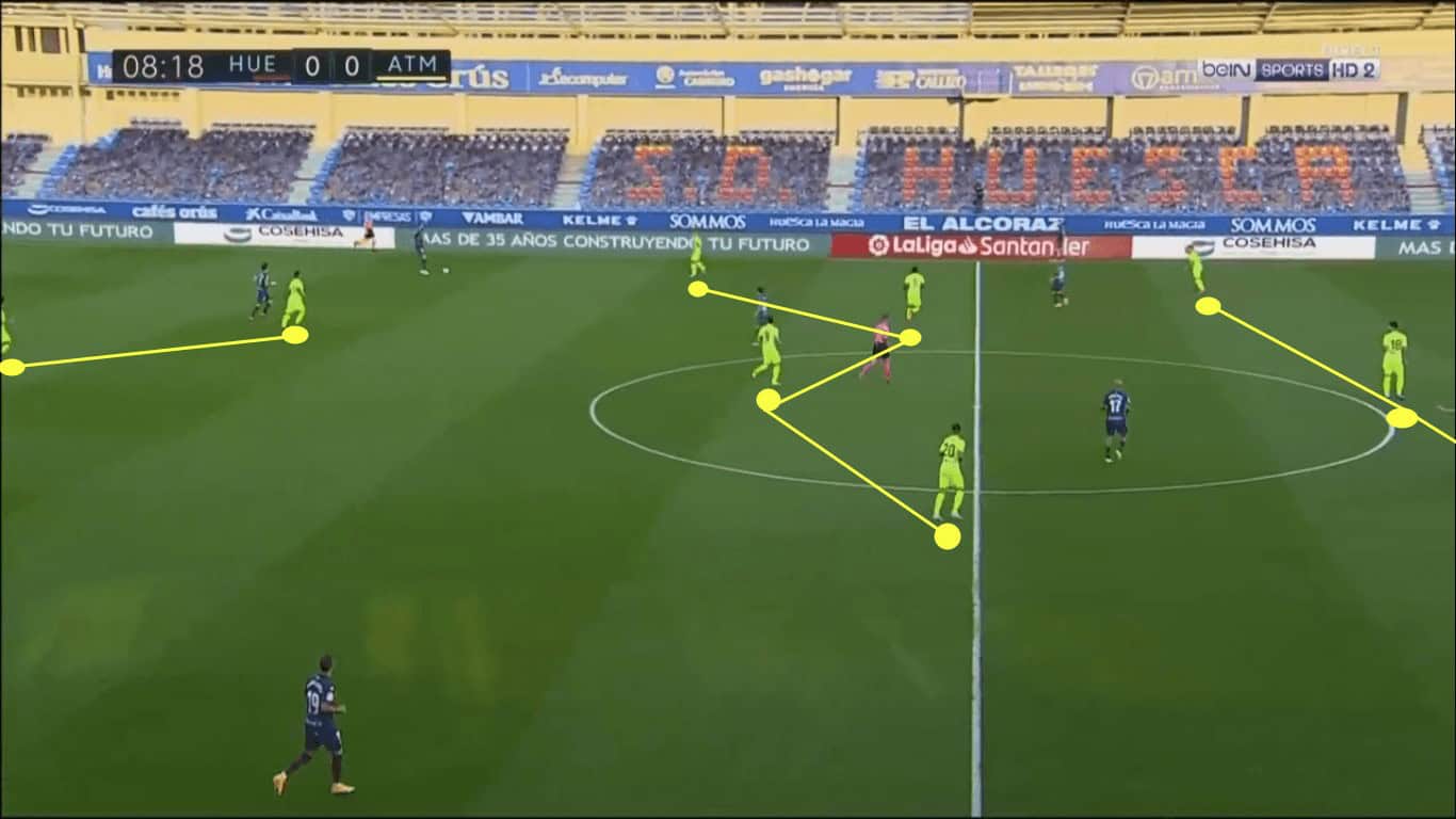 Looking at that average starting position map, you surely noticed the well-defined lines of Huesca and the two lines of three in the middle of Atlético Madrid’s formation. As mentioned, Huesca was very well organised, denying central progression. That forced Atléti to play around and over the opposition press.