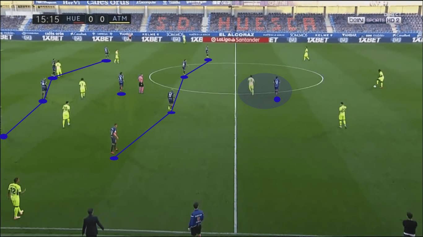 If the first rotation didn’t work, the pair would try again, as highlighted below. Notice in each image that López, the Huesca right-back, has the situation well under control. He didn’t bite on the checking runs, leaving space in behind for the runner.