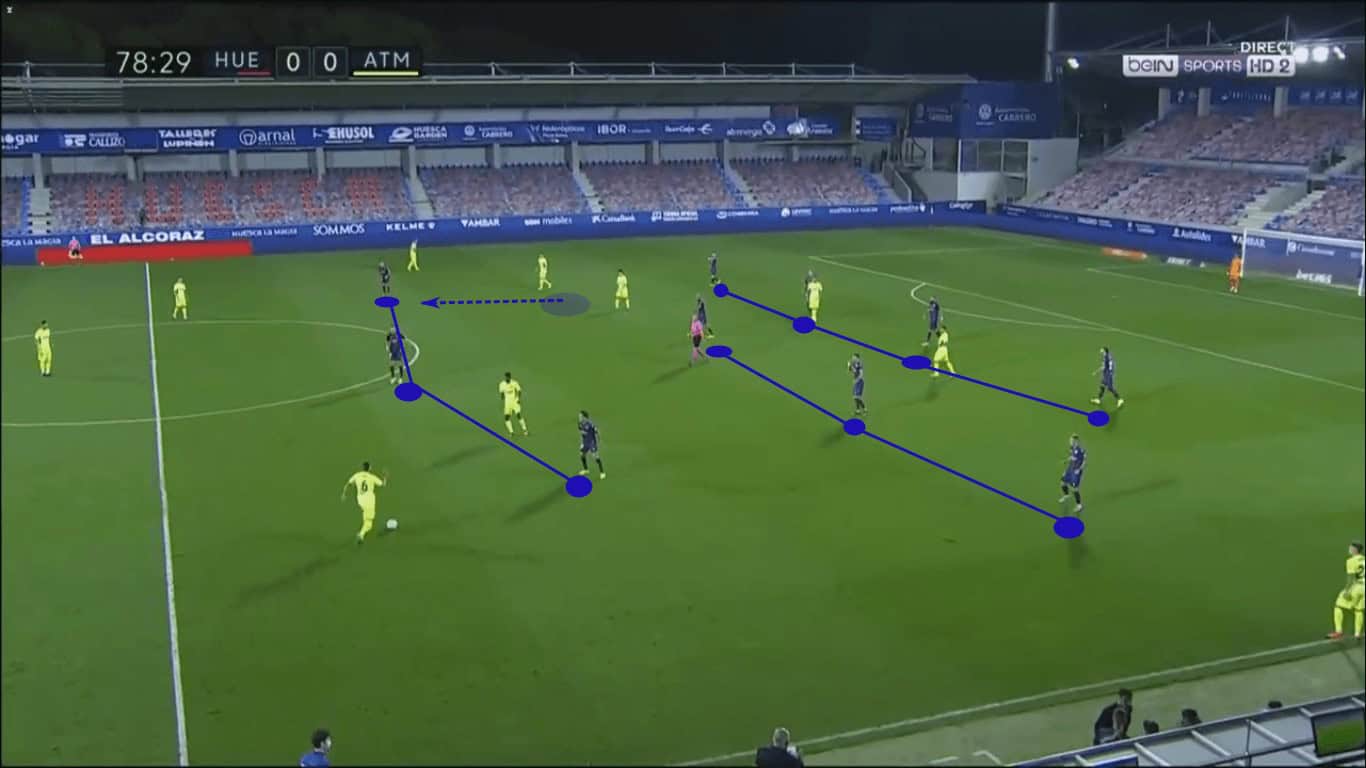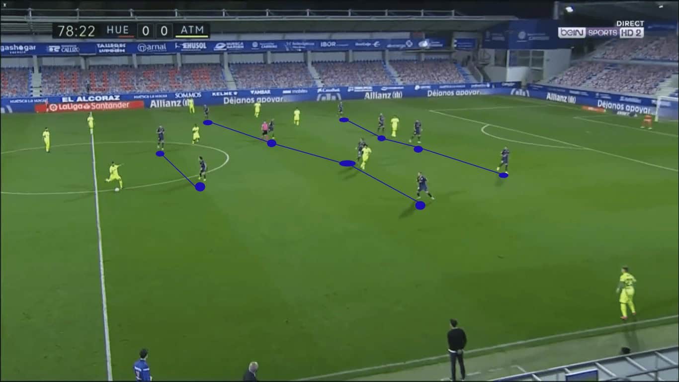 In the end, the adjustment they made was a subtle one, but, again, the objective was balance. As Atlético Madrid possessed near midfield, Huesca remained in their tight 4-4-2 defensive structure.