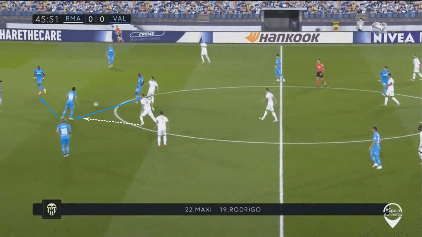 If Valencia can pull Casemiro away from the centre-backs and force Ramos into the midfield, they can open up that half space for progression through the dribble. Though I expect Guedes to start on the left-hand side, he and Gómez would do well to switch periodically. Given the pace of the Portuguese, he could combine with Musah to get behind Ramos and Mendy.