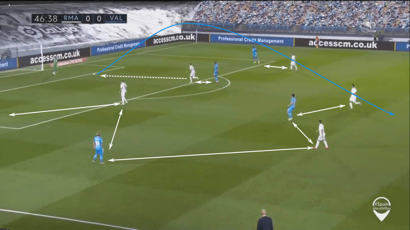 In their 4-4-2, Valencia will look to pin back Ramos and Varane, creating opportunities for progression through the half spaces. Kroos must offer coverage for Mendy, while Casemiro must do the same for Vázquez on the right.