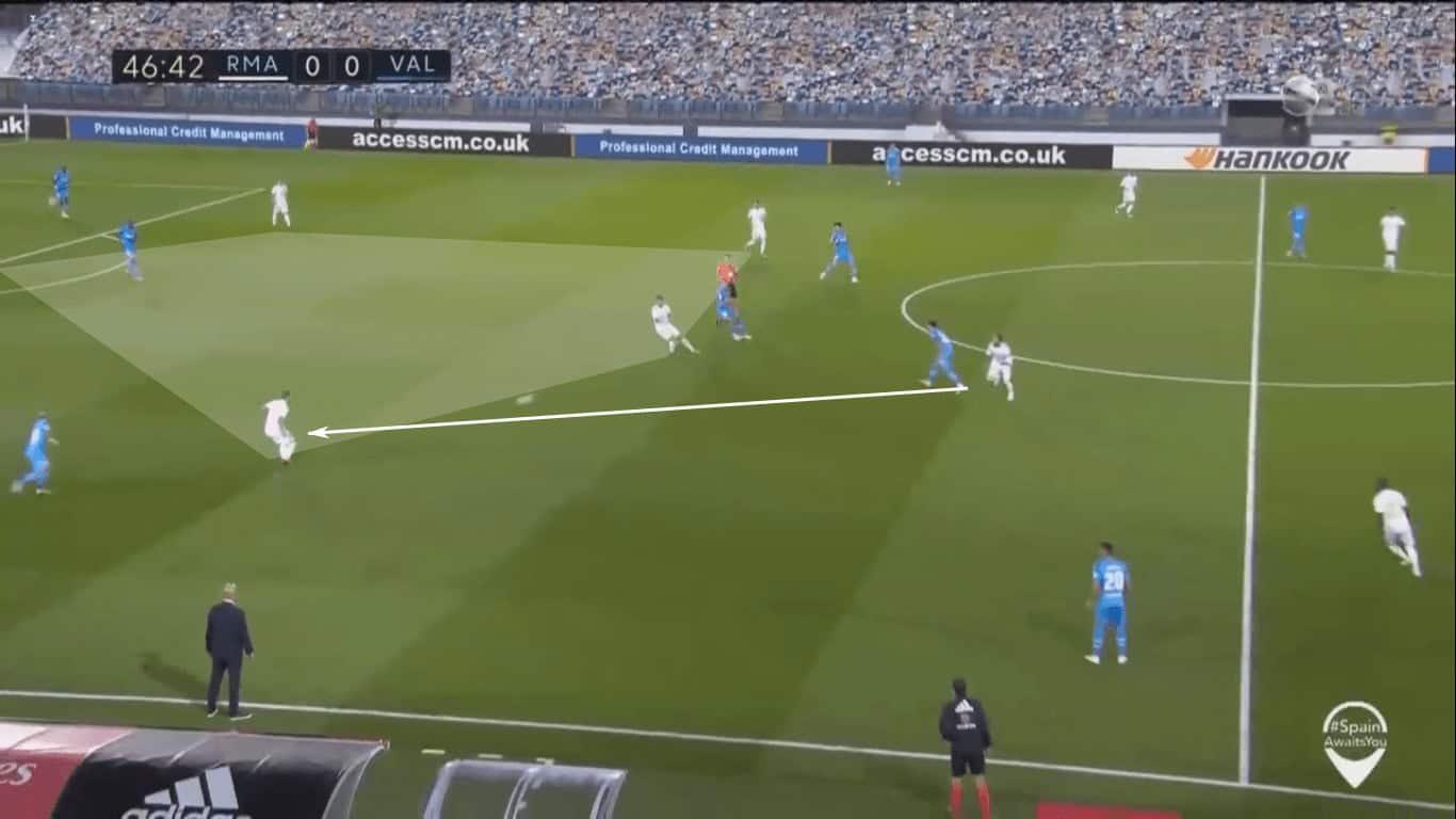 Since Valencia doesn’t expect to have much of the ball anyway, transitional moments will be key for Real Madrid. If they can deny immediate progression, preferably forcing Valencia to play negative, it will at least buy time to set their defensive shape. When the two sides last met, Real Madrid’s transition defence routinely forced Valencia to play backwards rather than immediately playing higher targets, just as we see in the image below.