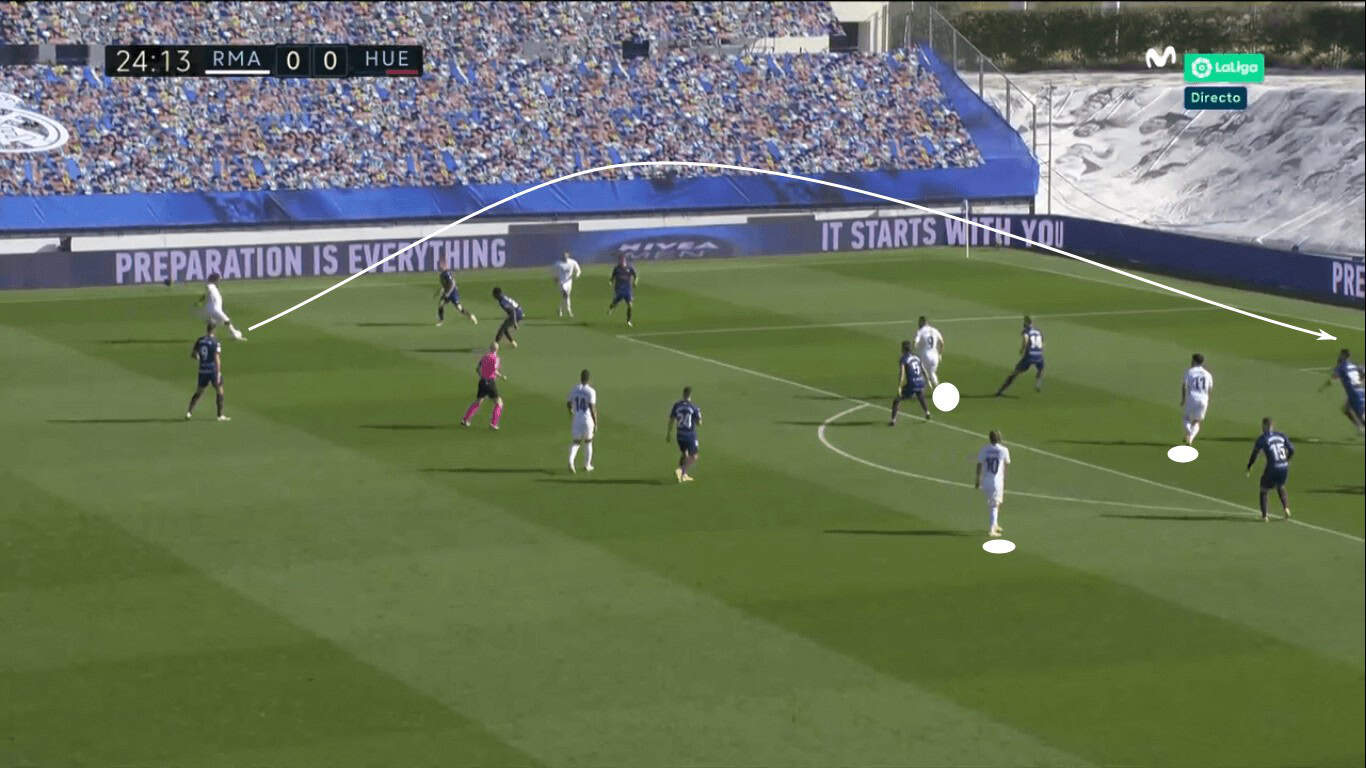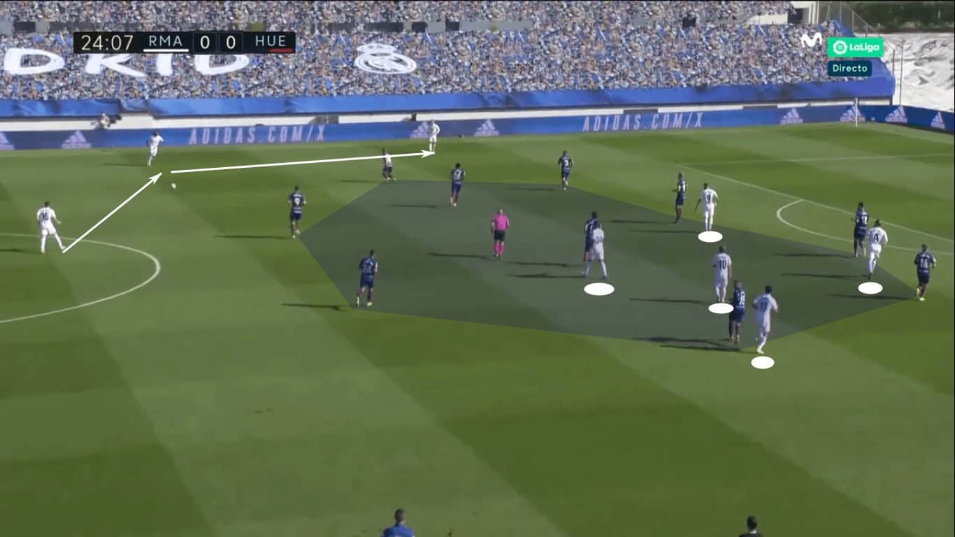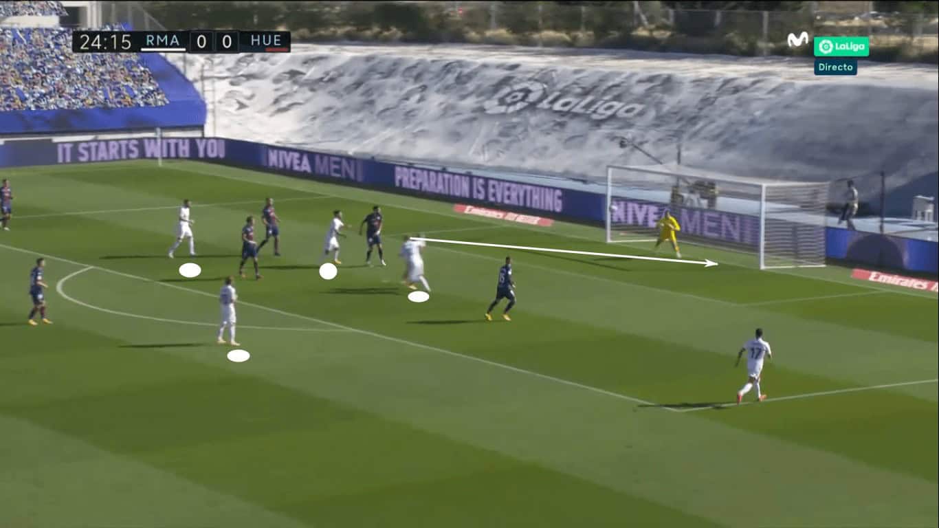 In the sequence below, we see Real Madrid working around Huesca’s low block. With the Huesca defence horizontally compact, they often forced Real Madrid to initiate final third entries into the wings. Here we have Marcelo and Hazard working together in the left-wing to prepare for the cross into the box. The sequence comes directly after a corner kick, so you’ll notice the white shirts and the central channel preparing for Marcelo’s delivery.