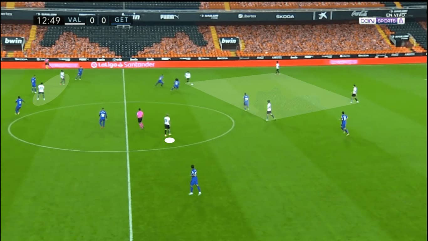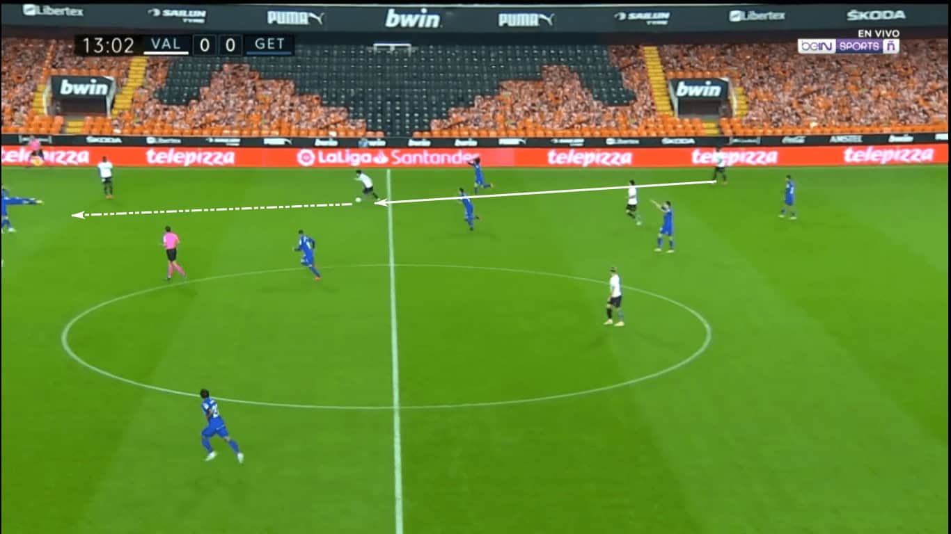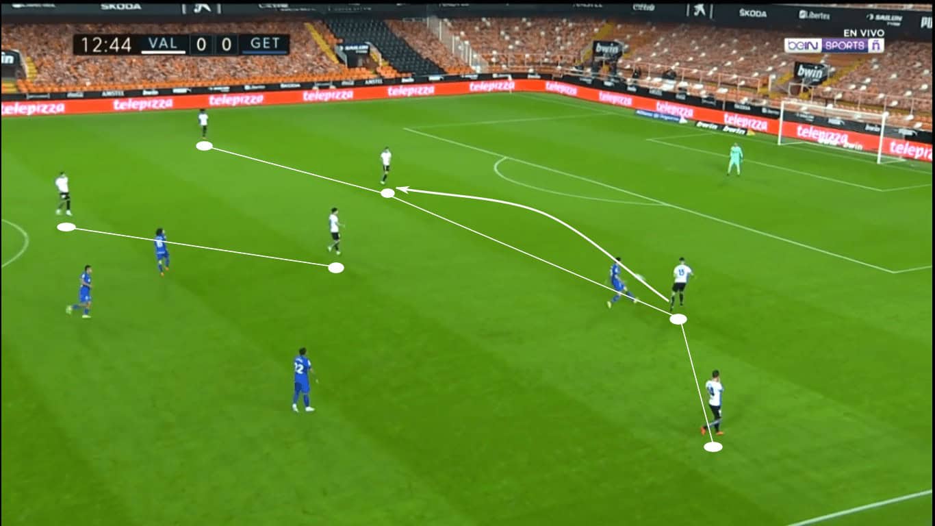 As Valencia moved the ball across the pitch, the idea was to create numerical superiority in one of the two wings and use the outside-backs as deep-lying playmakers. In the image below, Correia is unmarked near the touchline.