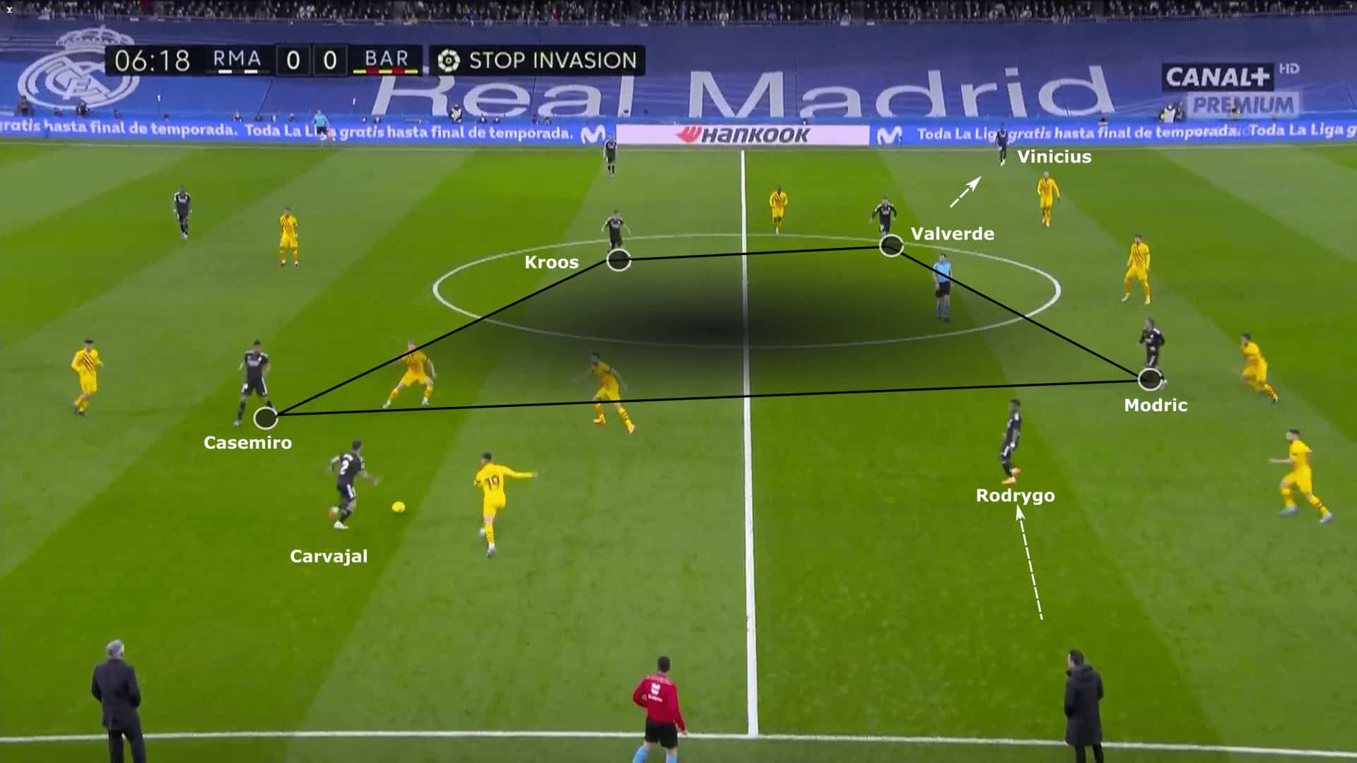 Los Blancos set up with a box midfield during build-up, with either Valverde or Kroos joining Modrić up top. Vinícius maintained as much width as possible looking to receive the ball and cut inside. Rodrygo would frequently drift centrally towards the two 10s to add an extra body in the middle.