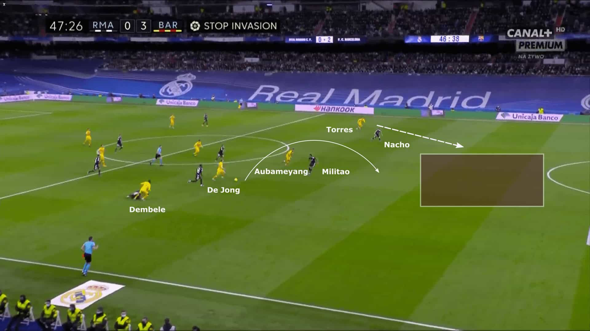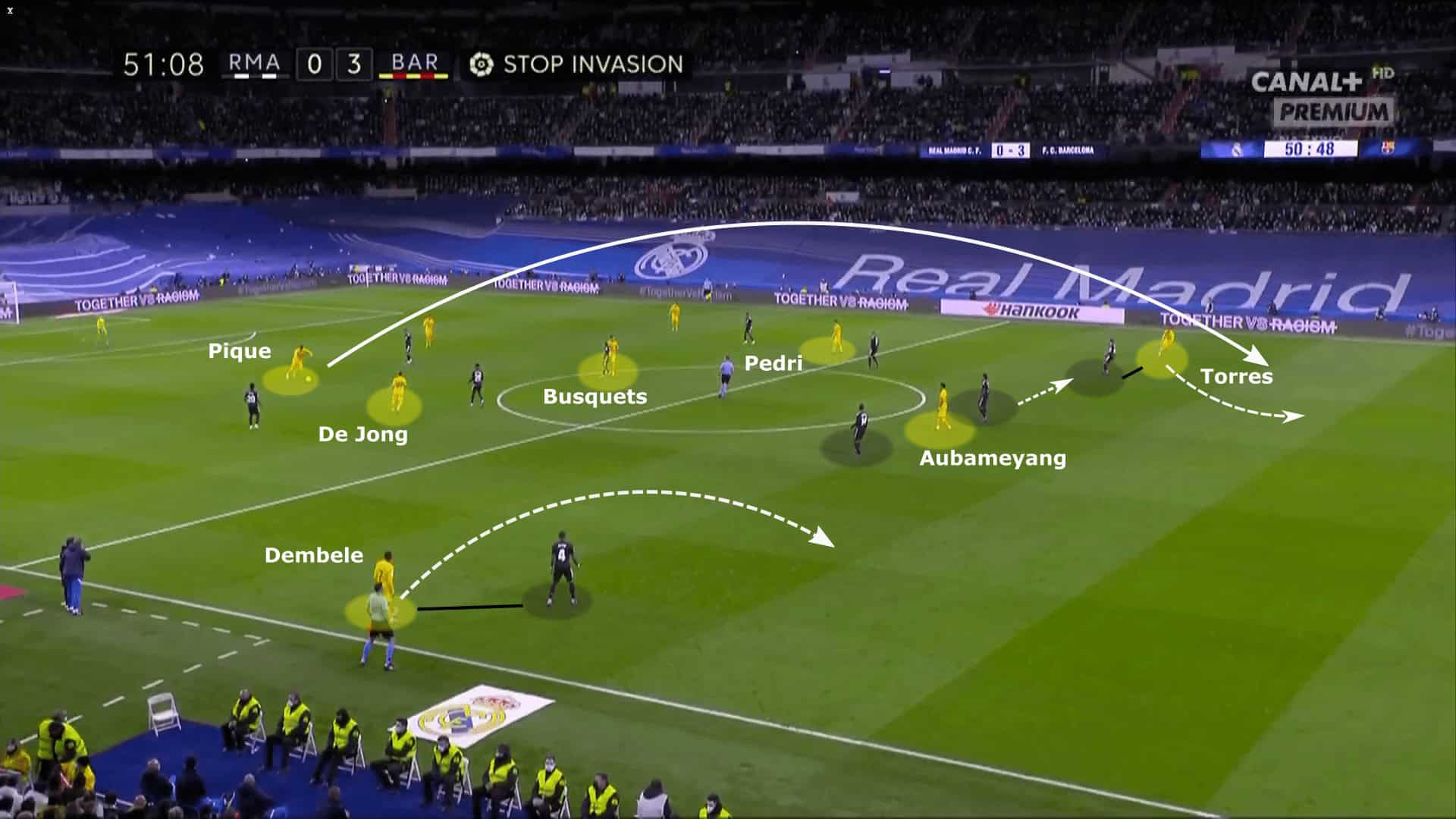 Minutes after the Torres chance, Barca found themselves through on goal yet again. De Jong playing as a free eight intercepts Alaba’s cross and drives forward. He then dinks the ball to Auba and Madrid can sense the trouble heading their way as their defenders are back-peddling. Barca now have the numerical advantage in the opposition box, leading to a 2v1 at the back post and Torres scoring the 3rd goal.