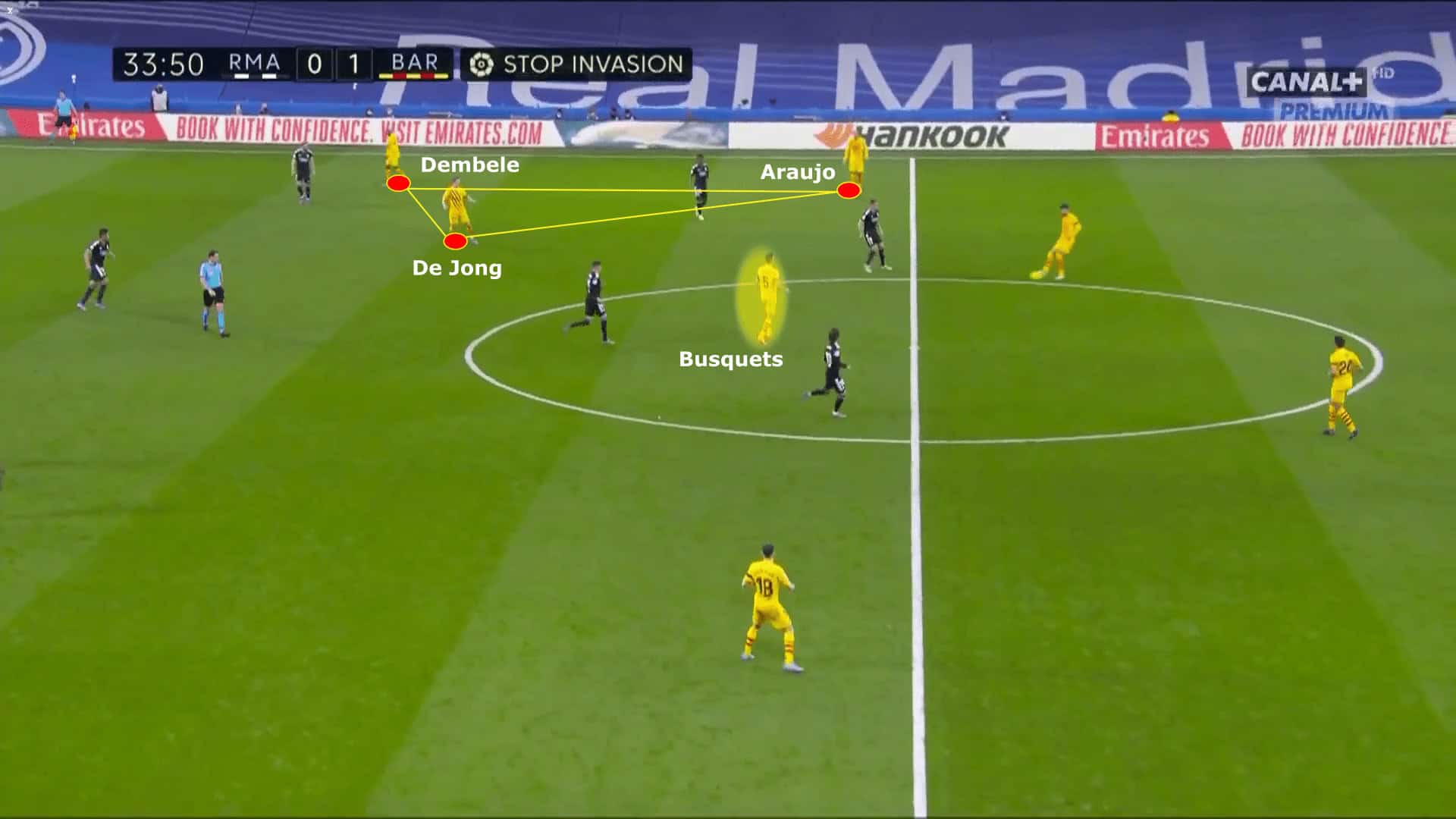 Also, Busquets helped Barca to control possession and move the ball forwards smartly. He always seems to be in the right place at the right time and never under too much pressure. During the game, Busquets was totally in control of the distance between himself and his opponents, particularly Casemiro, facilitating Barca’s build-up play. Moreover, his positioning and movements always had a purpose, mostly to try and free up De Jong further up the field as shown below. As he receives the ball from Piqué, a triangle could be created between Araújo, Dembélé and De Jong with the latter being in acres of space to collect the ball.