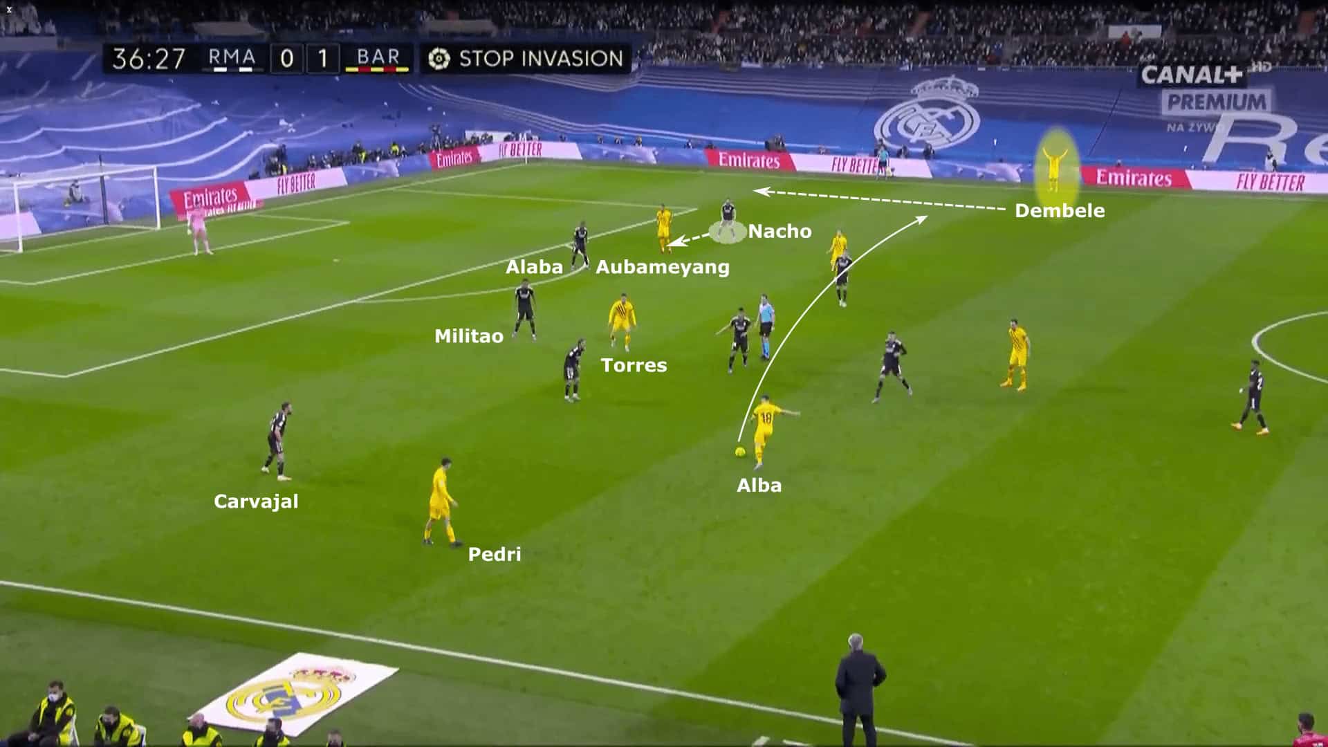 As we can see above, Modrić and Kroos are covering the pivot instead of pressing high but Piqué has no issues to make the pass through to Busquets. When this is successful, Barca find themselves with a numerical advantage while Casemiro and Valverde try and cover the men in the half-spaces. This enabled Barca to create a 5v4 situation in attack. If the ball was received by a player in the half-space, Madrid’s fullbacks were drawn towards him, leaving the wide winger isolated. Dembélé receives it on the right drawing Nacho into a 1v1, an area Xavi’s men detected as a weak link in Madrid’s backline. This led to a Dembélé sprint and cross which was scored for 1-0.