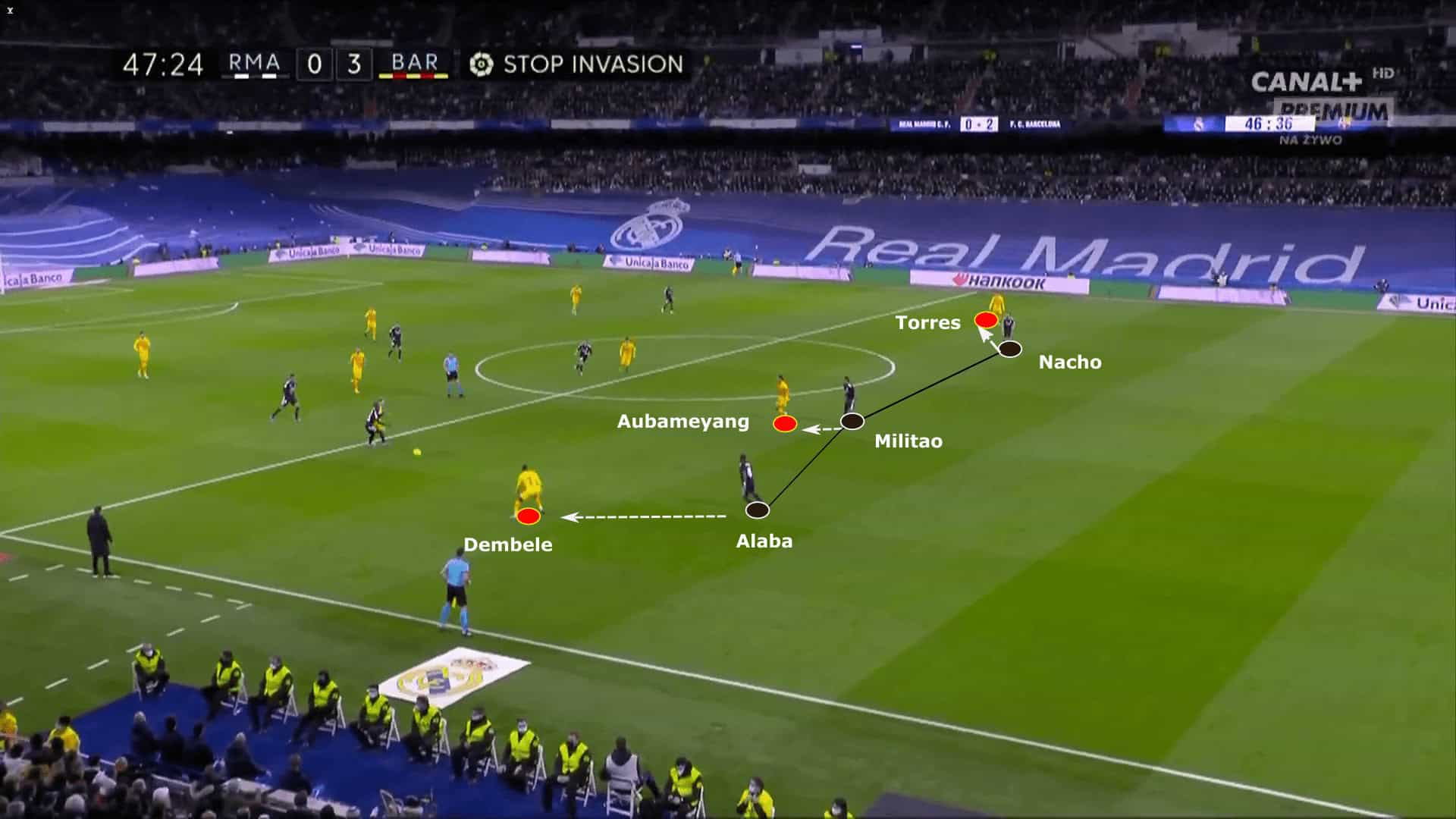 With Madrid deploying a 4-3-3 without the ball for the majority of the second half, Barcelona could no longer benefit from the central midfield overload. Aubameyang was closely followed by the two CBs and could not enjoy as much service as he did in the opening 45 minutes, forcing him to drop deep to receive the ball on several occasions. The positioning of the wingers; high and wide at the touchline, created big gaps in behind with Alaba now at LB and Nacho at RB forced to mark Dembélé and Torres tightly. Torres found joy running in behind Nacho, breaking free twice in the first five minutes of the second half alone. Piqué’s long ball reaching its target and the two new January signings linked up for Auba to tuck away the visitor’s 4th goal of the night.