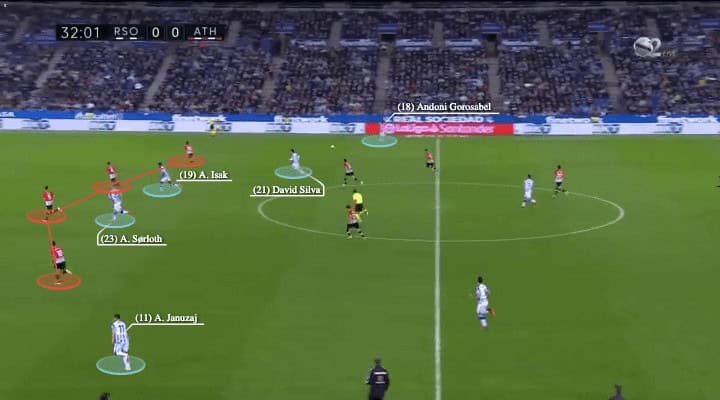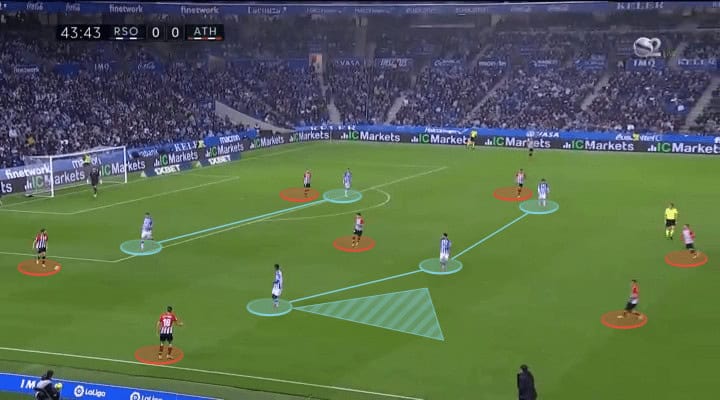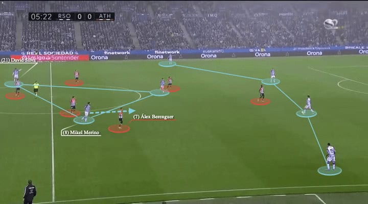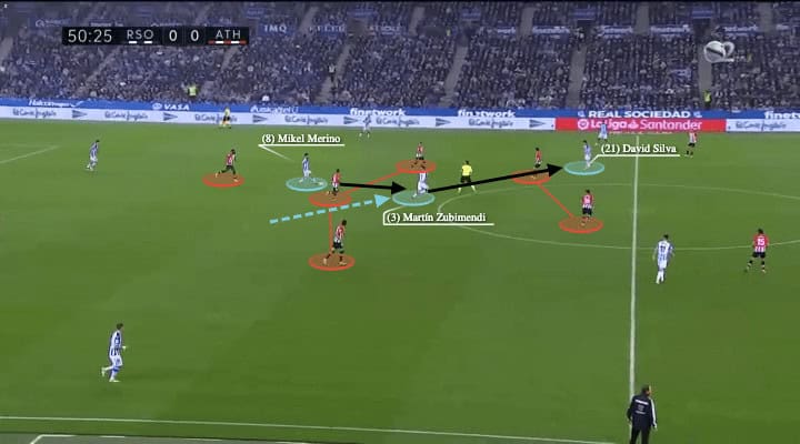 The advantages over a 4-4-2 were clear too. In the first line, there was a 3v2 numerical advantage and they should free at least one of the half-spaces (red spaces). To fix the position of strikers and create a midfield 3v2 overload, Merino, would stay between the first and second line. As they also had half-spaces occupation (Silva and Januzaj), the Athletic Club wingers would want to stay inner to shut the channel, so wing-backs would be free in the wide spaces.