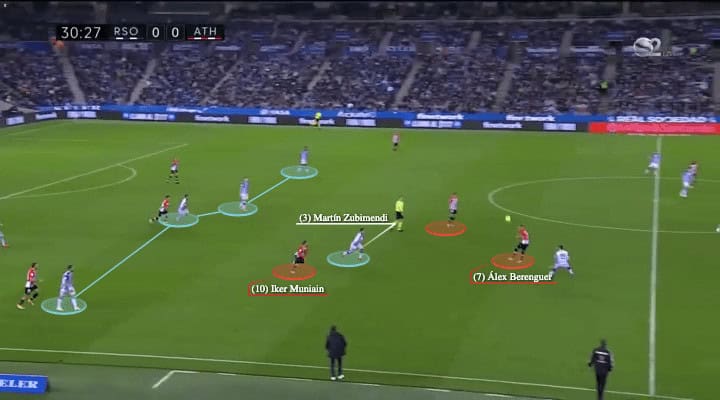 Here shows the attacking structure of Athletic Club above. Usually, Berenguer was closer to the strikers, and he would serve as the long ball target. On the other hand, Muniain would get into the centre to connect teammates. With these setups, they dominated spaces around Zubimendi. A simple long ball would bypass the press and as Muniain attracted the holding midfielder, spaces were opened in the centre.