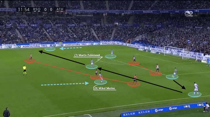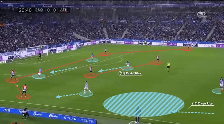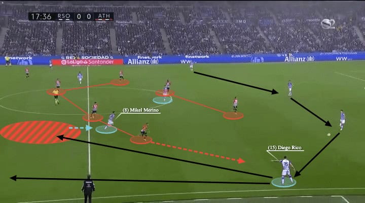 The drop of Merino also created different options for Rico. In this game, Sociedad mainly focused on going behind with wingers attacking the last line, but the half-spaces were also opened (zone red) as the Athletic Club midfielders were dragged away. That’s why they tried both wrong-footed wingers and wingers with correct foot in this game.