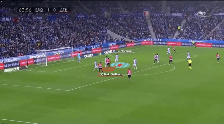 Marcelino’s men were also well prepared as they attacked the box in a smart way. They knew the Sociedad centre-backs have habits to drop back into the six-yard box against the crosses, and leaving spaces around the penalty spot were exposed. Therefore, they also place the crosses in those areas (blue spaces) in this game, with strikers meeting at the endpoint. From the above image, Iñaki Williams suddenly attacked the blue space, and exploited Robin Le Normand’s loose defending.
