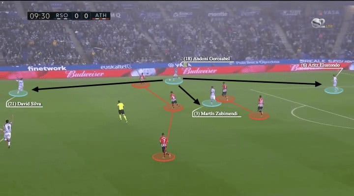 Here, in the above image, Sociedad pressed in that way. When the striker and the far side winger closed the centre-backs, Athletic Club moved the ball to the right flank, so Januzaj could jump onto the right-back. Silva, as the attacking midfielder, must shuffle from covering one central midfielder to the other, so they made sure the options around the ball were closed.