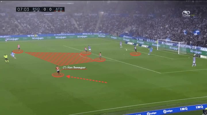 Then, there were controllable elements, as Sociedad knew their full-backs will be pressed diagonally from the inside, and their stronger foot had more time to play the forward pass. You could tell from Berenguer’s press on Rico above.