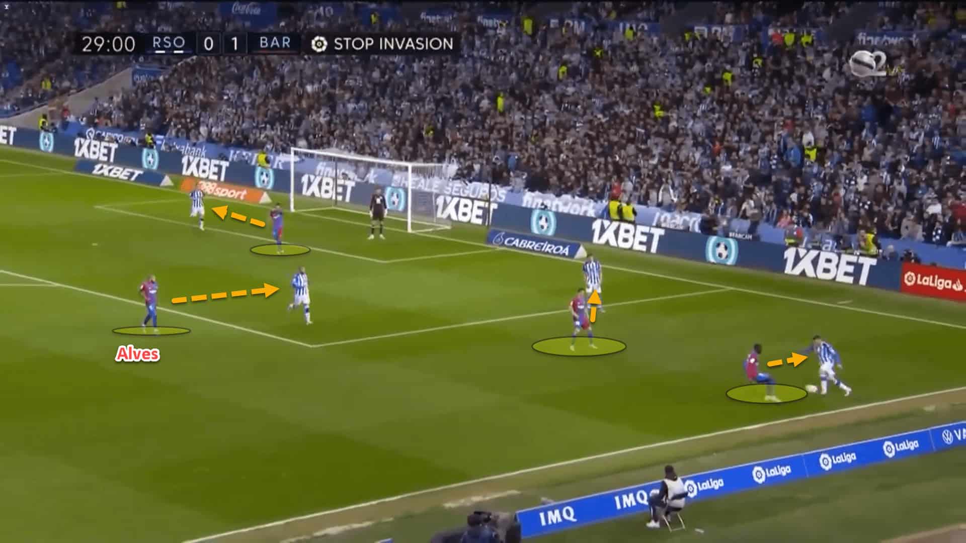 Because Alves would be dragged deeper, it would leave just three defenders at the back: the two centre-backs and the left-back, Jordi Alba, against La Real’s two centre-forwards in a 3v2 situation. To offer a progressive option up the pitch, the two strikers would pull wide from each other and play with their backs against Barca’s right central defender (Araujo, until his substitution) and Alba.