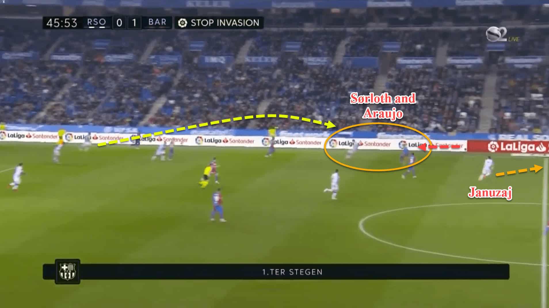 Both Alexander Sørloth and Alexander Isak possess an innate ability to hold up possession. Araujo held his own against Sørloth on the right as he was able to match him for physicality but there was a complete mismatch on the opposite flank when Real Sociedad went long to Isak against Alba.