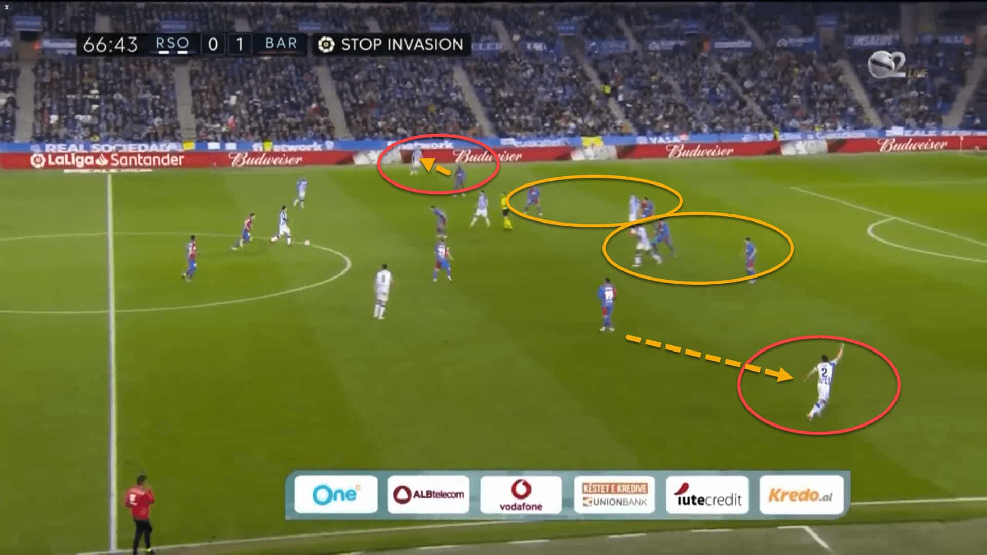 Nevertheless, there was a downside to this intense and strict marking scheme. Within the first few minutes of the game, Real Sociedad were able to adapt to Barcelona’s tactical set-up and changed their approach during the build-up phase.