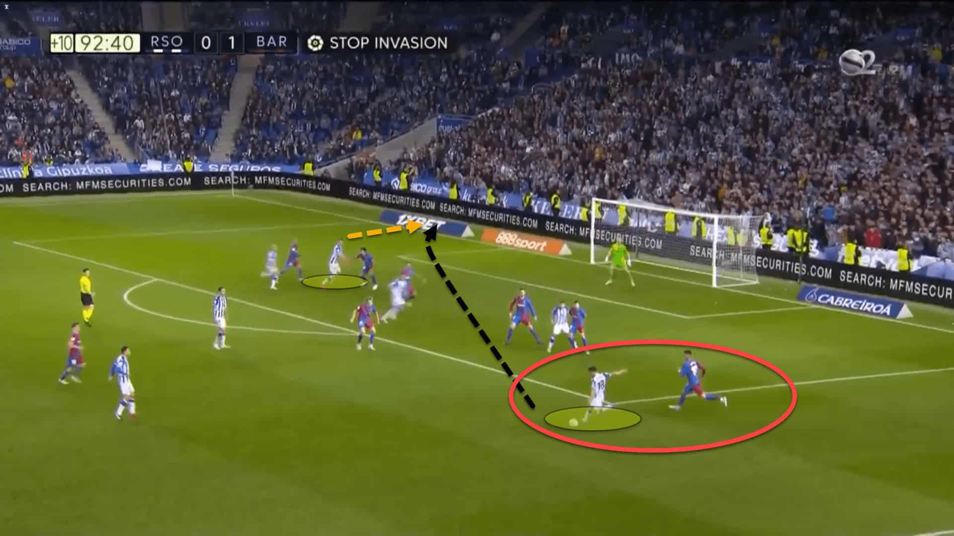 Furthermore, either Sergio Busquets or Frenkie de Jong would then step up and man-mark Real Sociedad’s single pivot, Martín Zubimendi, in the high press in an attempt to prevent any passes into his feet.