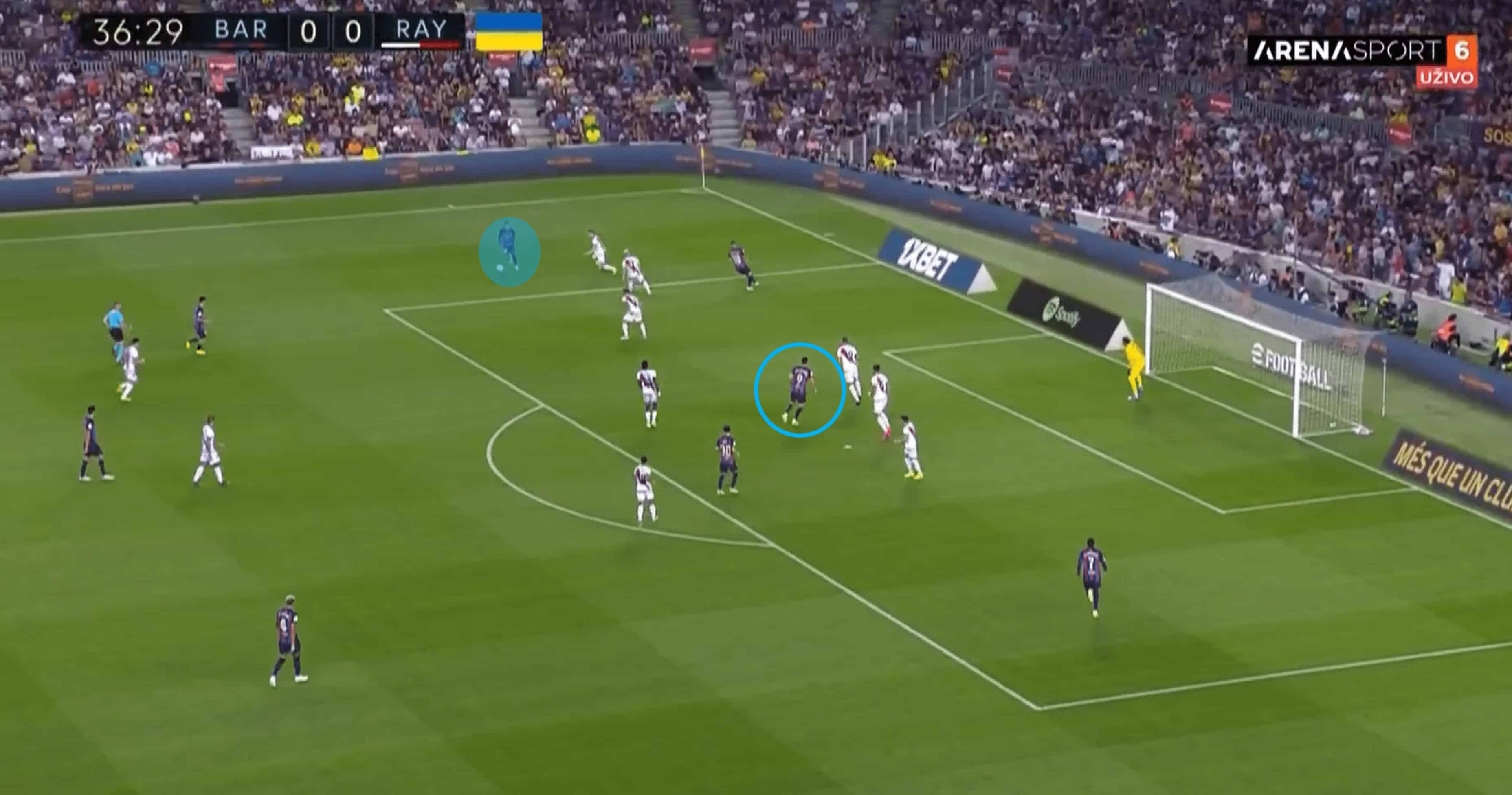 The Spanish giants did show some creative sparks in attack to combat the resolute Rayo defending, but again, the final product was simply not good enough. This example shows a scenario where Barca had comfortable possession in the attacking third with the visitors still refusing to defend deep. The highlighted central Barca players made a run that cut toward the left of the box in a bit to receive a through ball from Dembélé but the Frenchman was clever to use their runs as a decoy as it forced a shift from the Rayo backline, leaving Raphina in promising space. The pass from Dembélé was crisp, but Raphina was unable to turn it into something of any real danger.