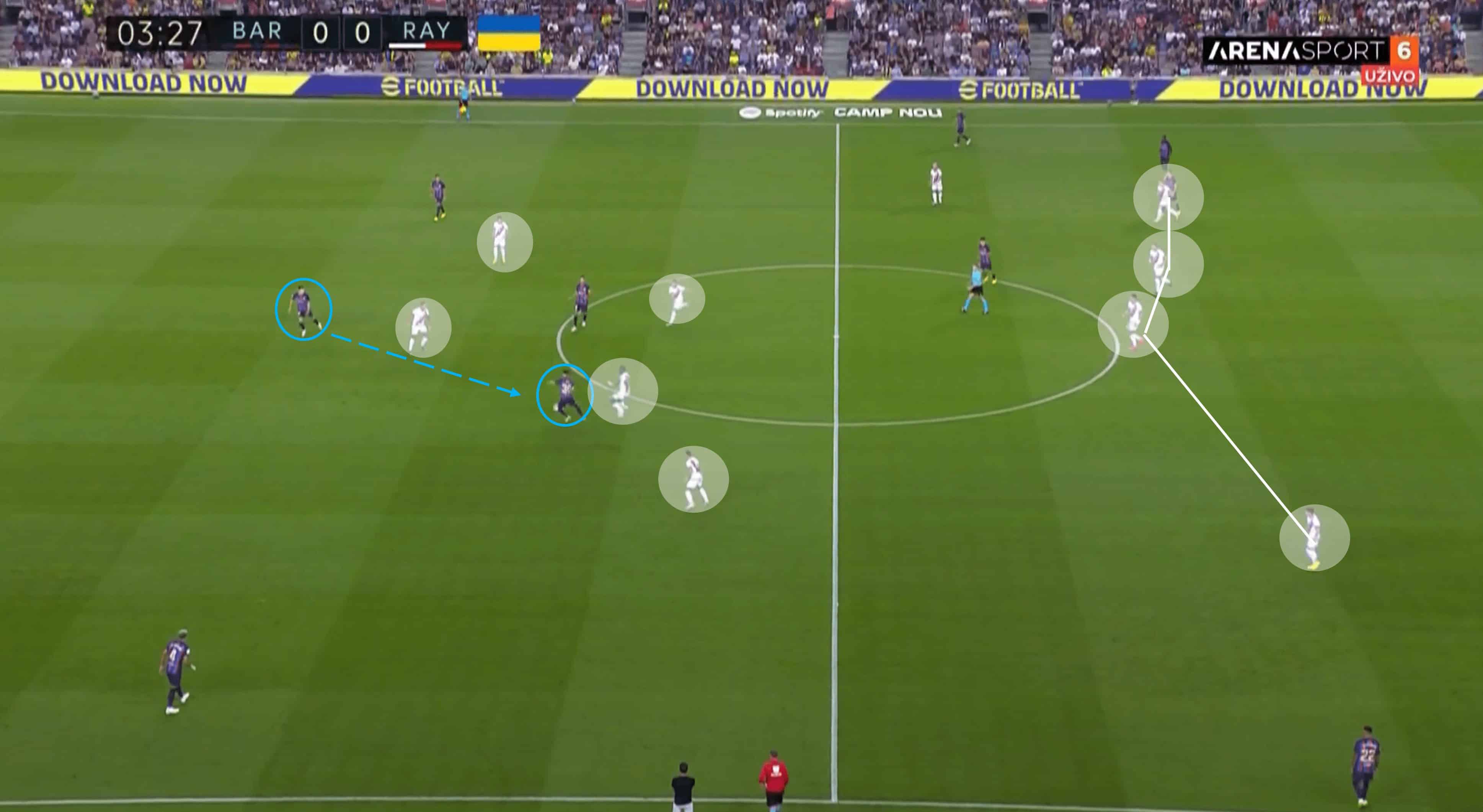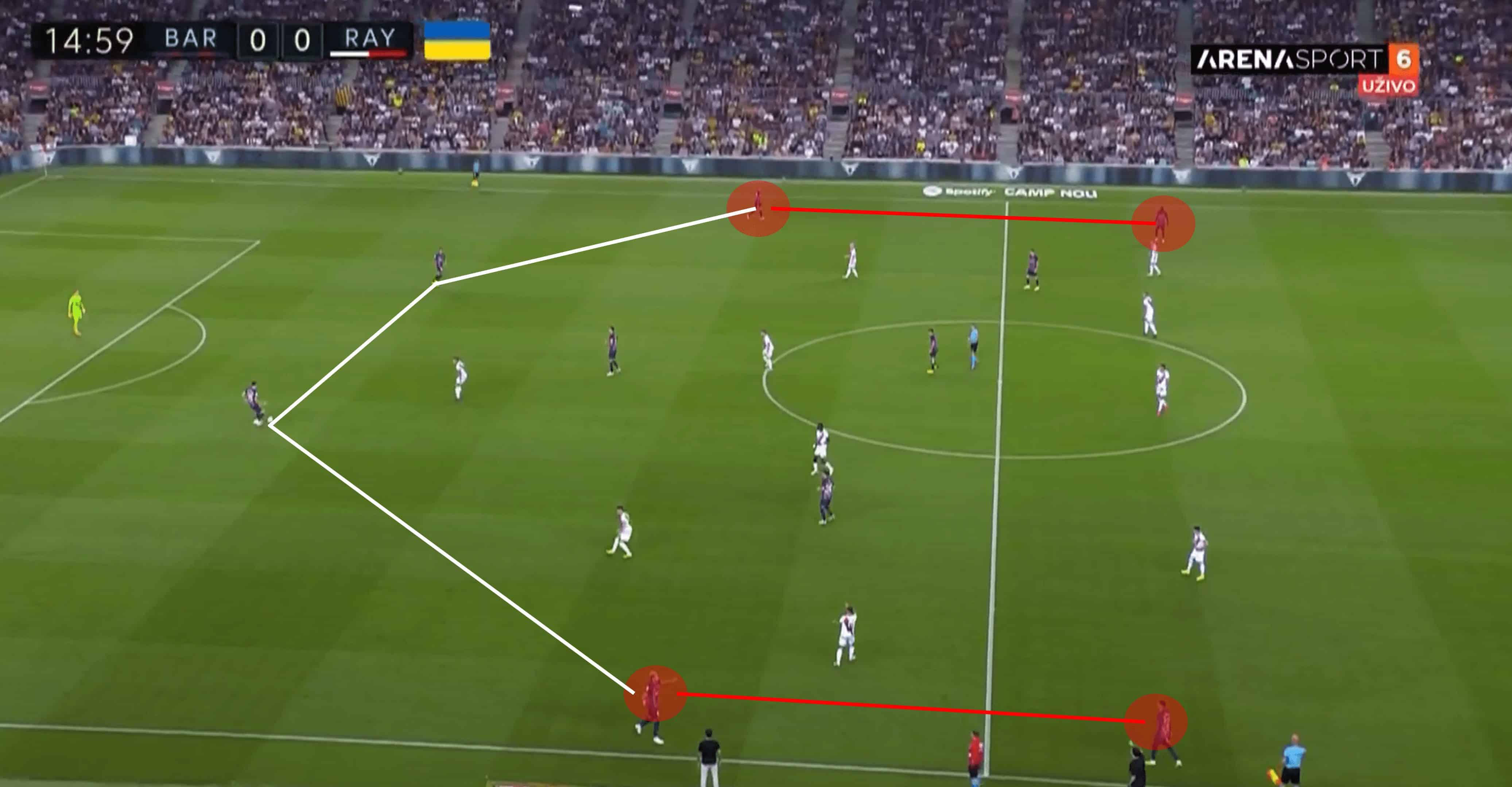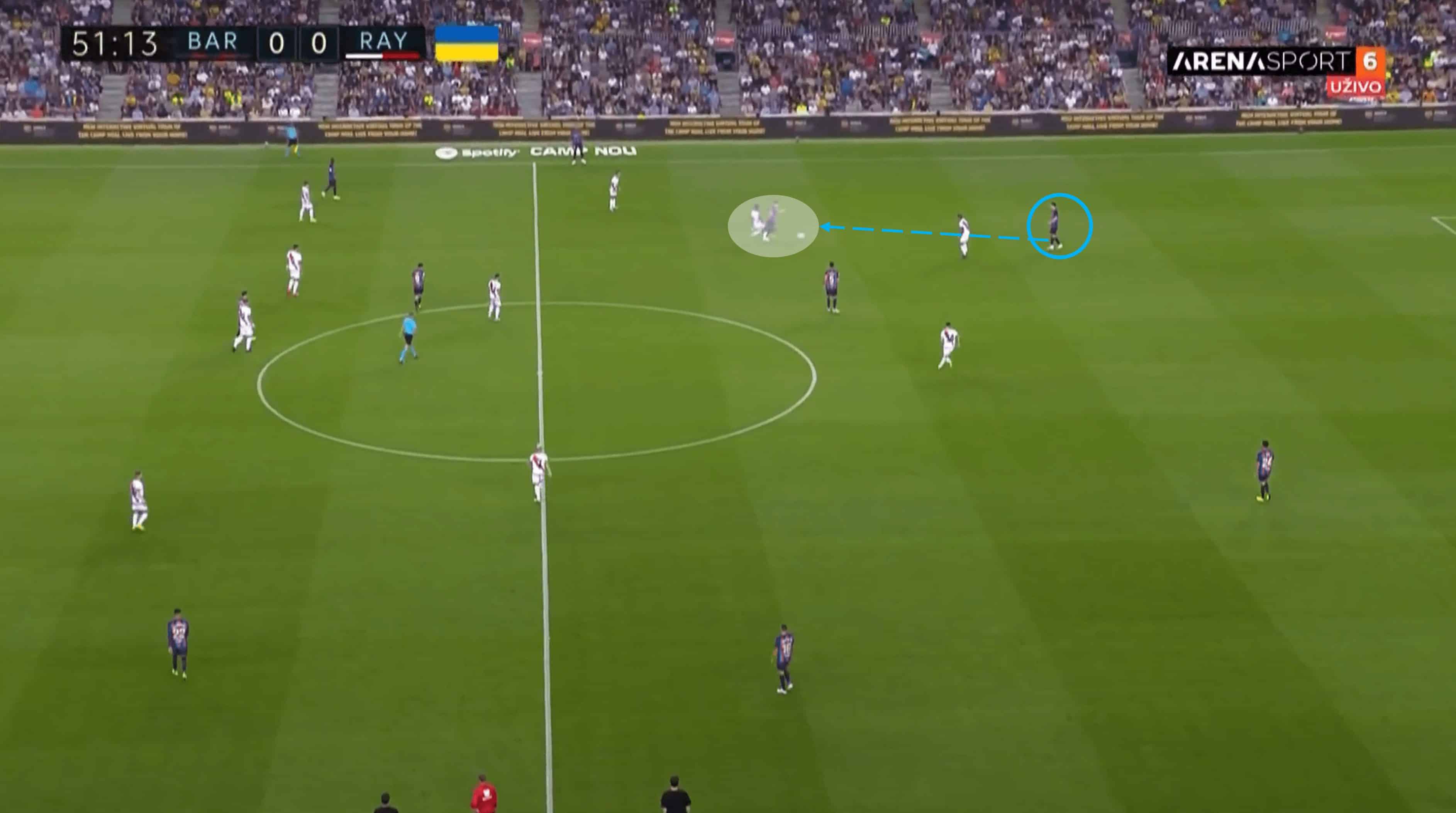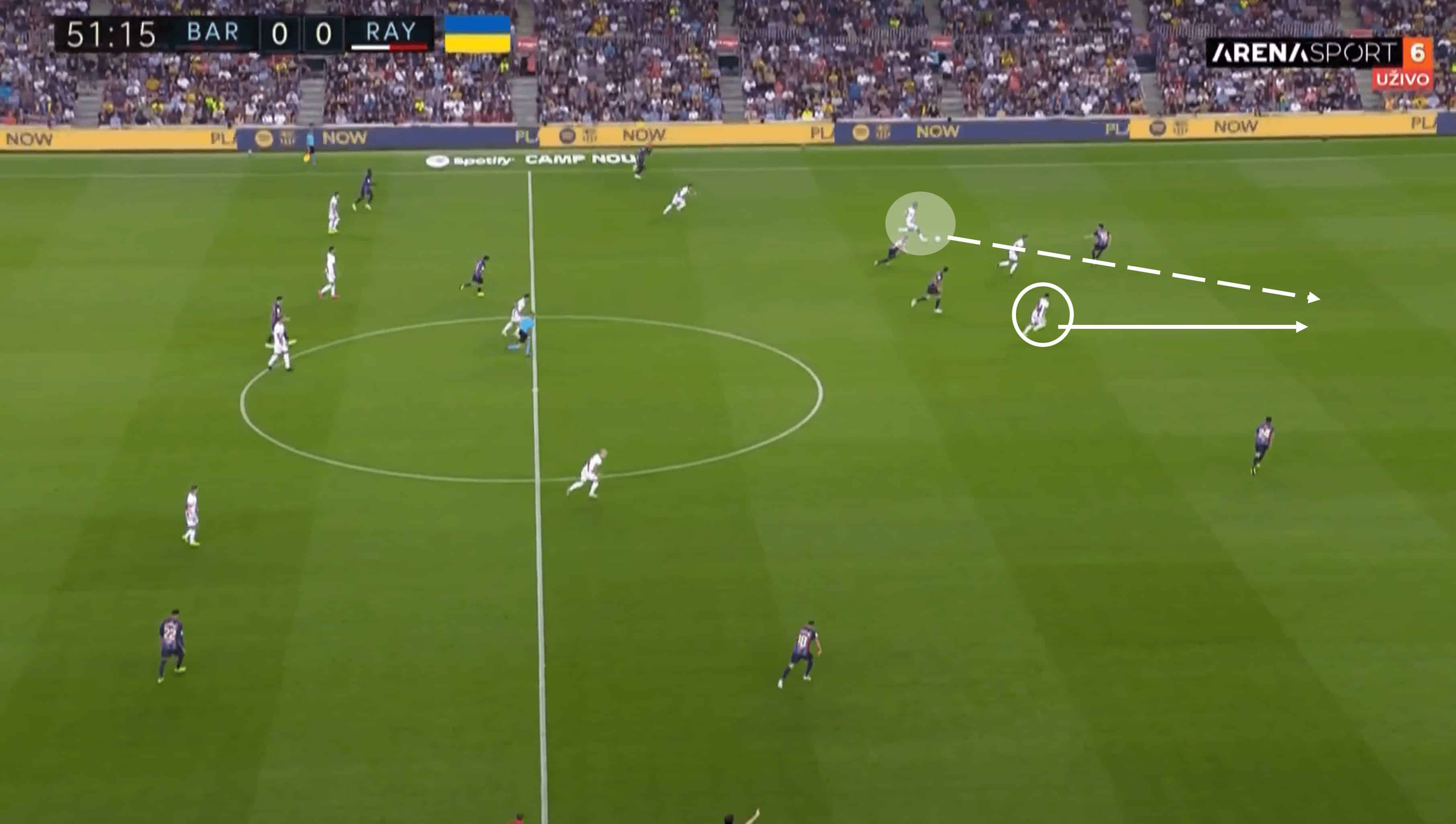 As you can see from the match timer, this image was taken just four seconds after the previous where Barca looked to be locked out of the Rayo half. A lack of pressure on Eric García and his initiative to carry the ball forward forced Rayo’s midfield back slightly and created spaces in a couple of areas for the hosts. In particular, Raphina is the man on the right flank with acres of space around and in front of him following that movement.