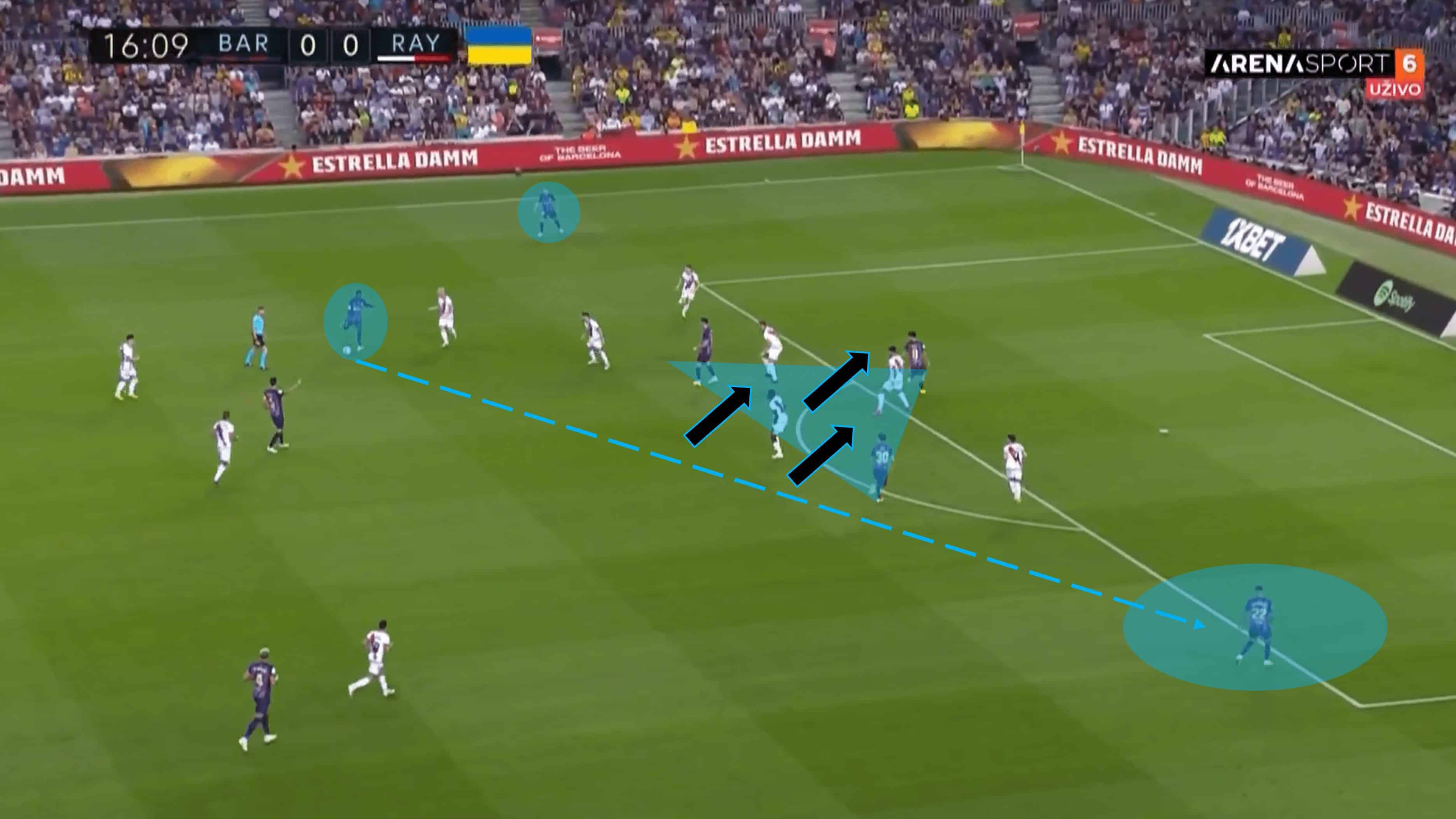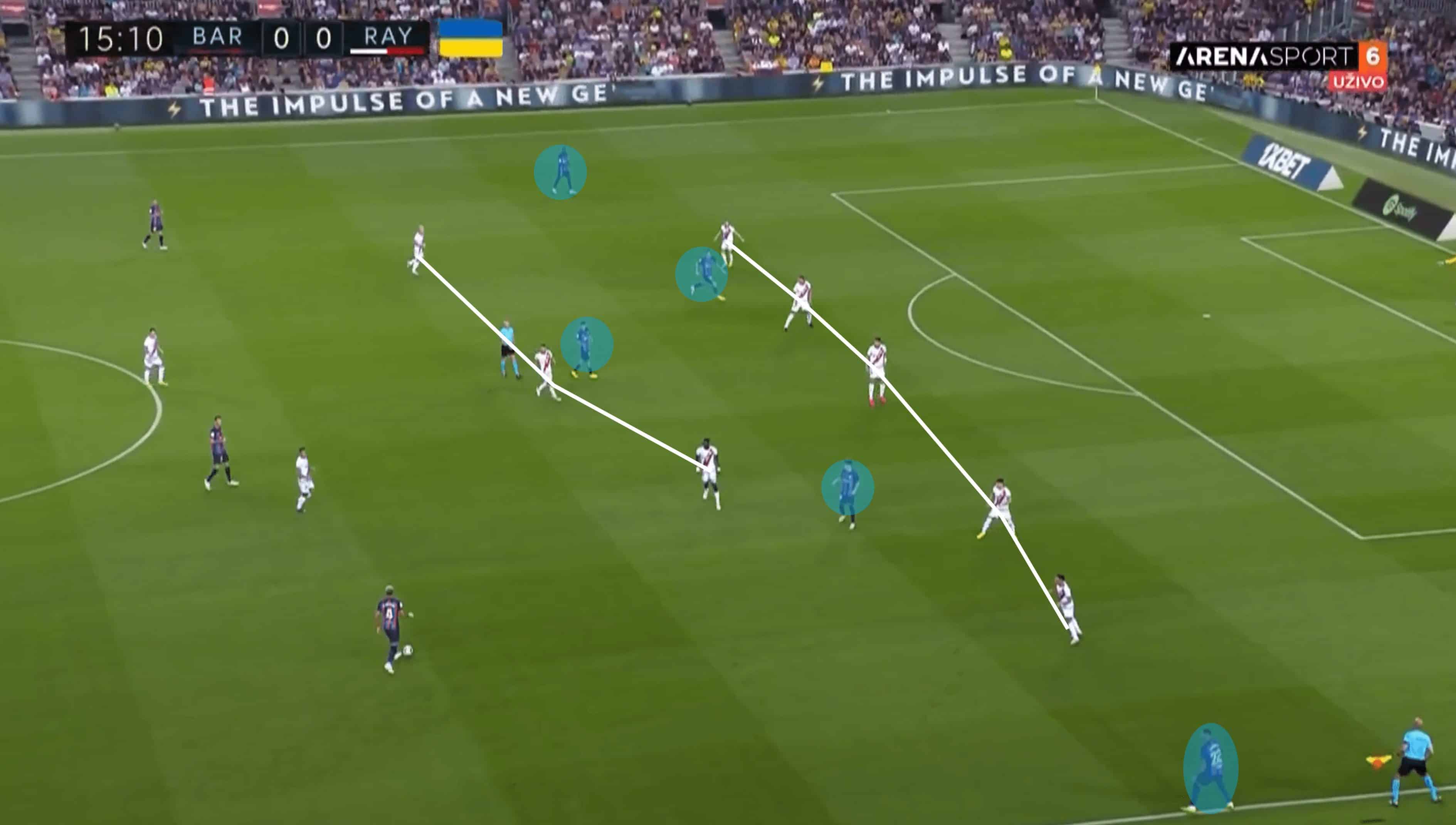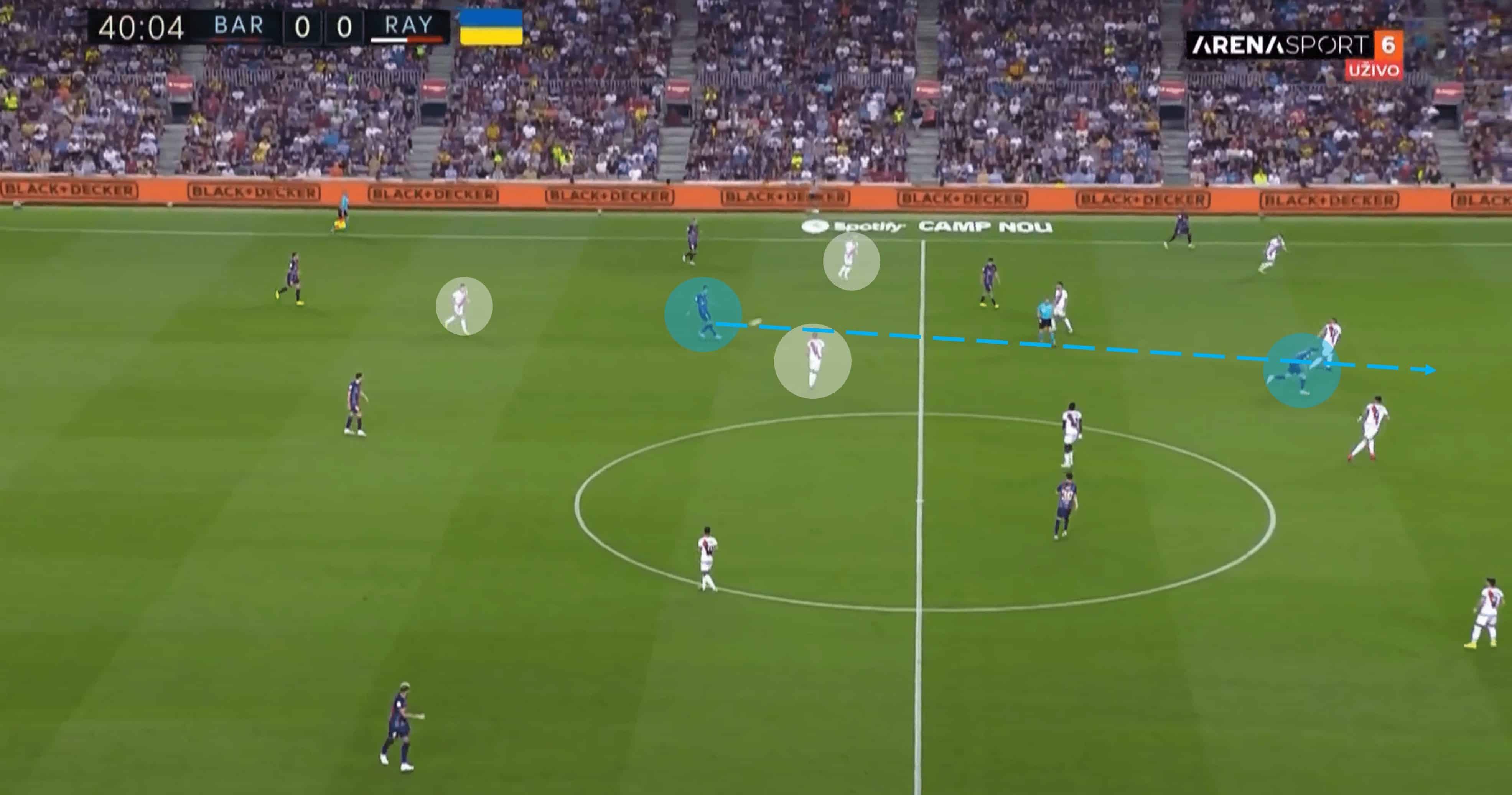 In line with their philosophy and tactical approach, Barcelona’s shape has often involved a lot of width with the full-backs operating alongside the midfielders to bolster its unit’s presence. This game was no exception, but it felt like this tactical approach was used more in response to the Rayo press, to combat their efforts. Below, we take a look at how Barca focused their play down the flanks and how they would beat and unhinge the initially resolute Rayo defensive set-up.