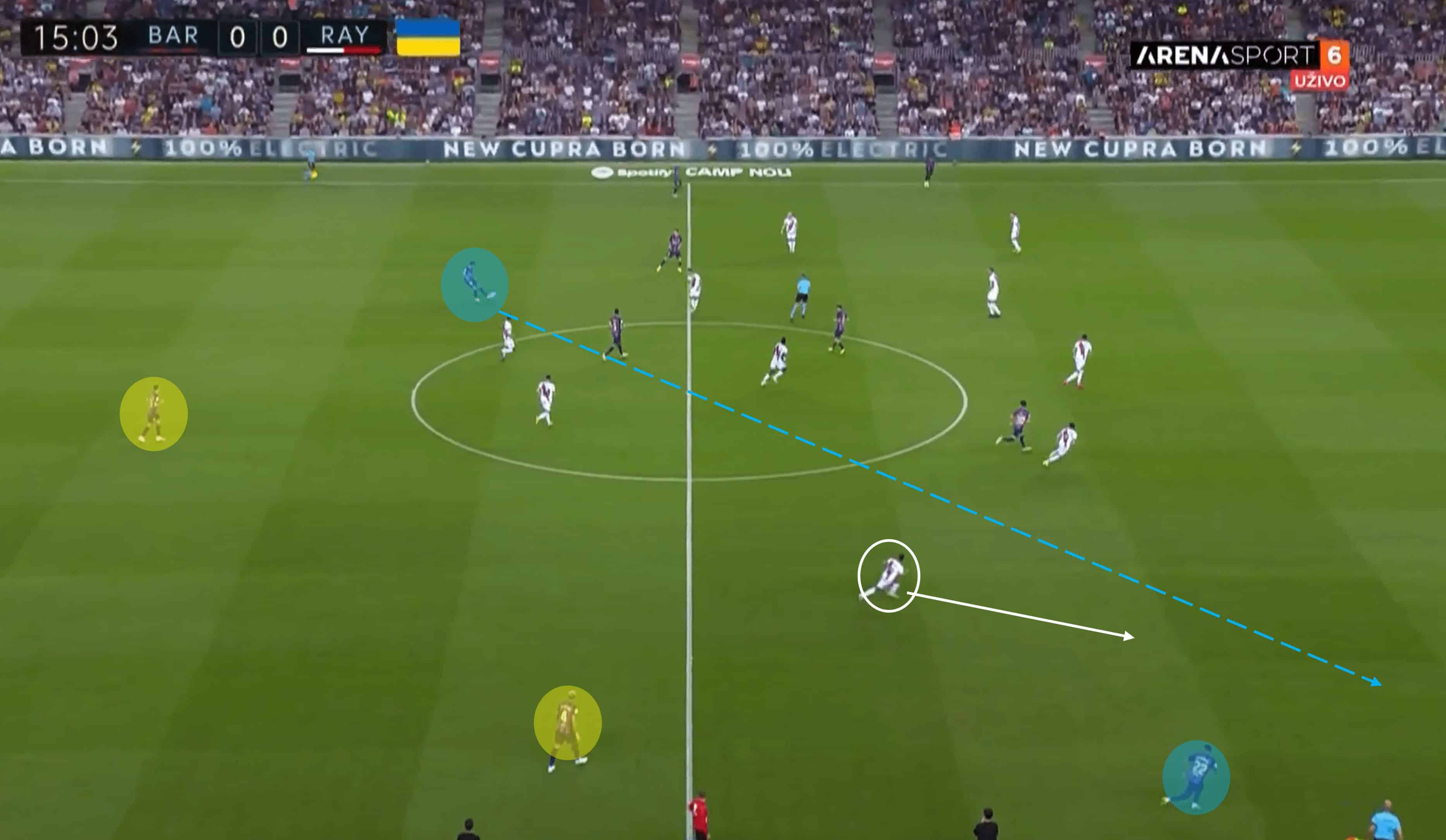 Due to the forced retreat of Rayo, the back four had to come together and be more compact to offer stronger protection, meaning it was Álvaro García’s duty to track back and mark Raphina – which he failed to do. This allowed the Brazilian all the space he could ever dream of, and the pass from Eric García to match. An interesting and clever feature of this move is the tactical depth shown by Xavi’s men, with the highlighted (yellow) players offering an alternative path to hit the right flank. Below is the continued analysis of this segment.