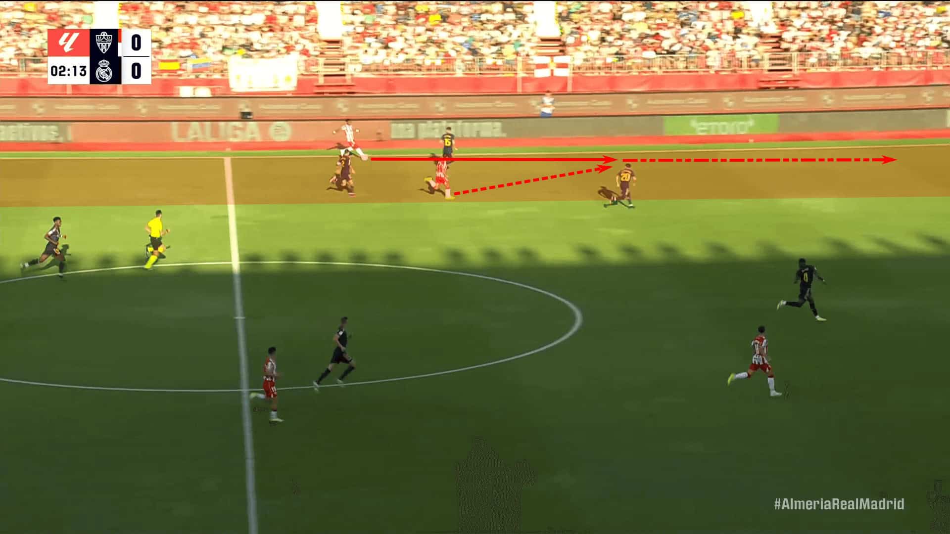 With Carvajal and García pushing high up the pitch, which we’ll discuss momentarily, Almería attacked Real Madrid’s 2-3 structure at the back during counterattacks.