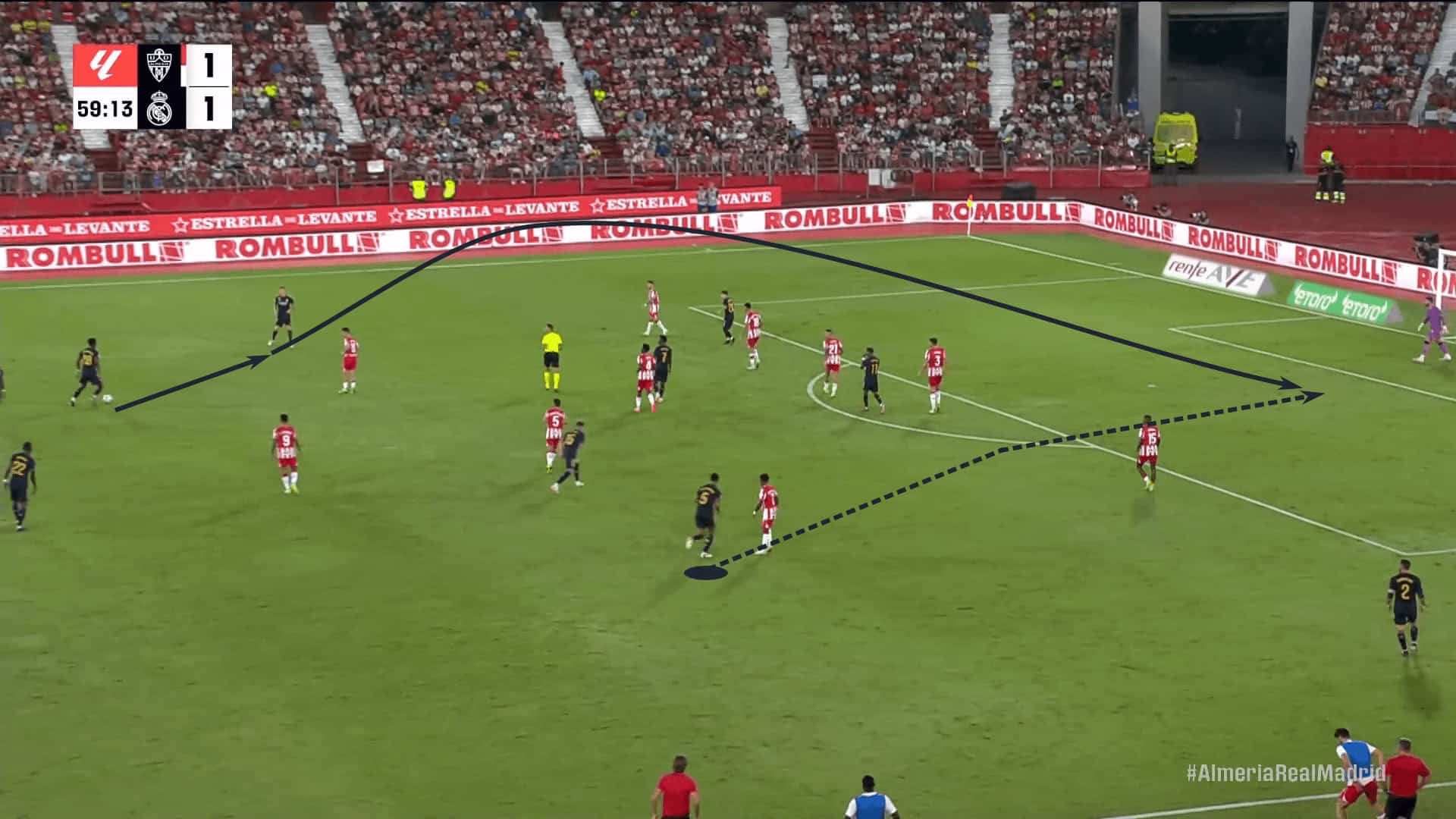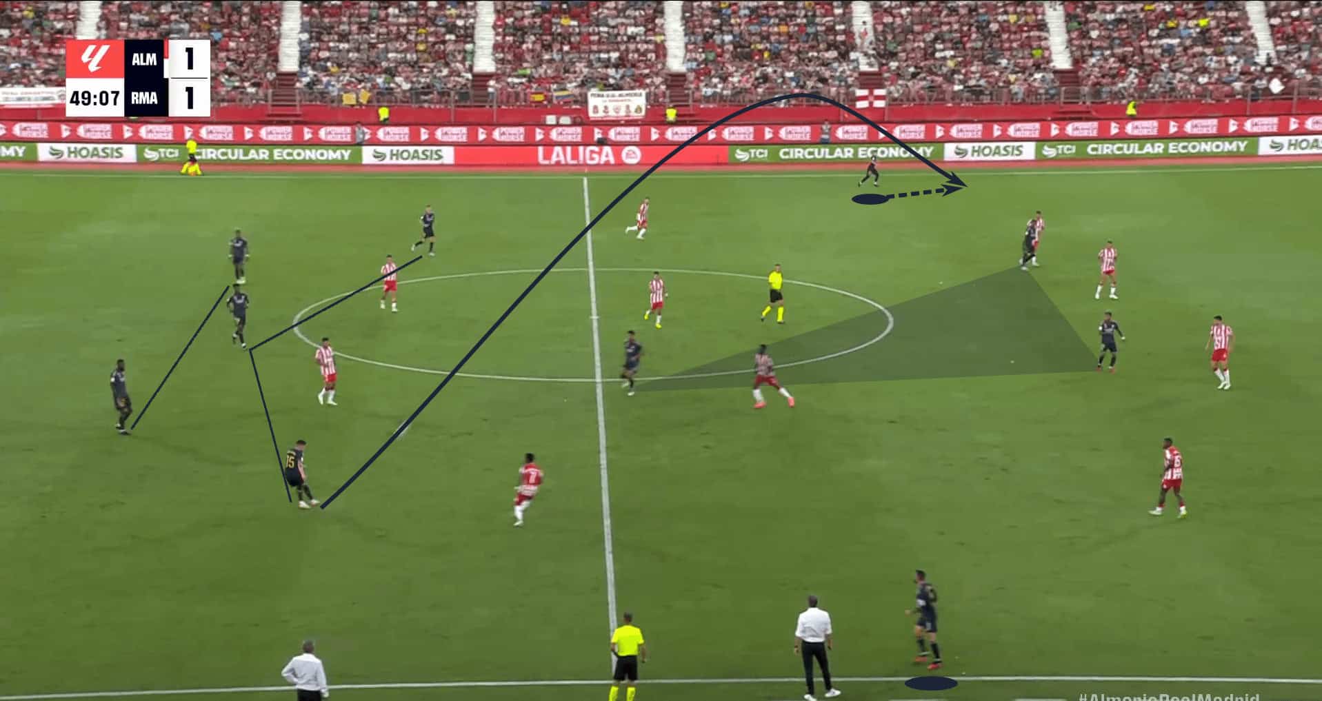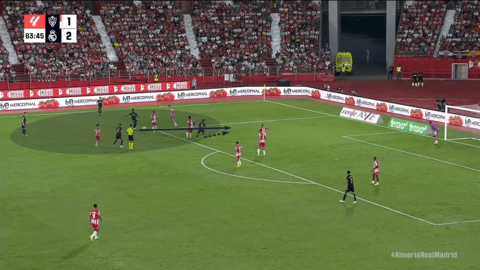 Rodrygo made a late checking run into an open pocket of space, corresponding with Bellingham offering a run behind the Almería backline.