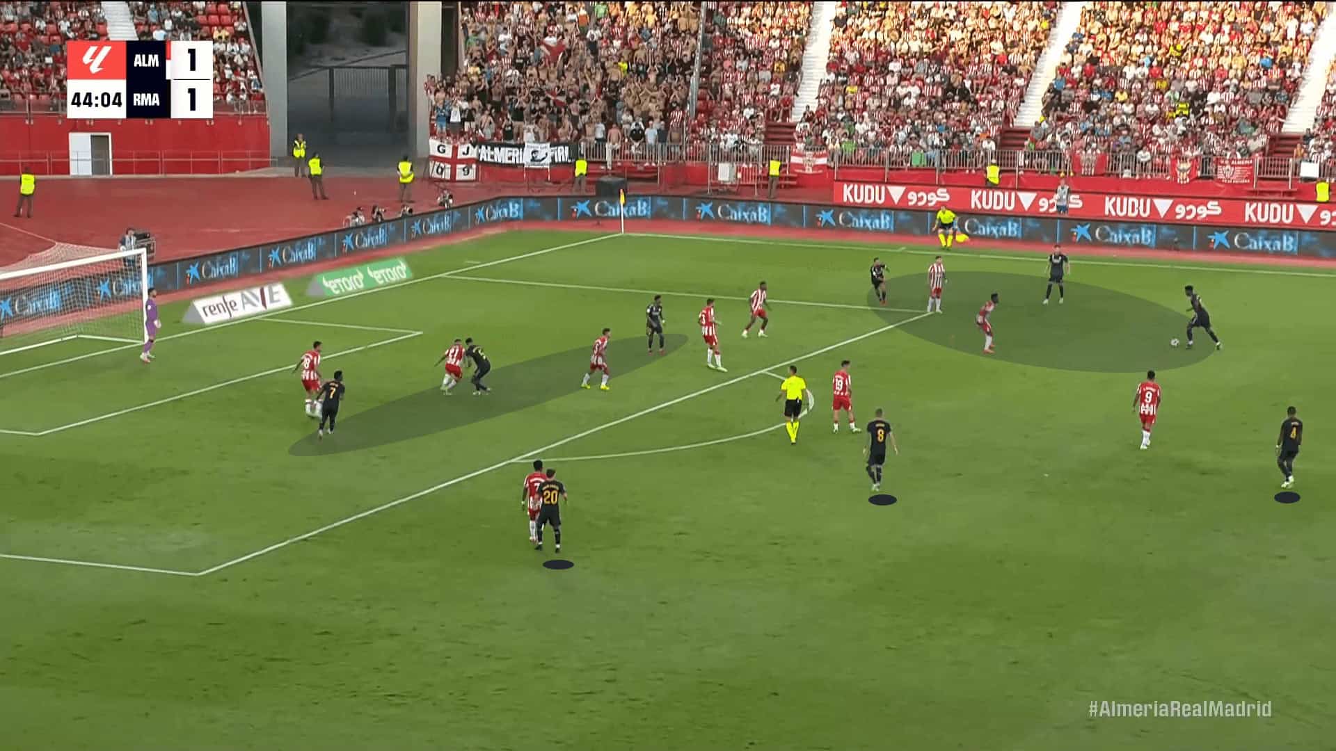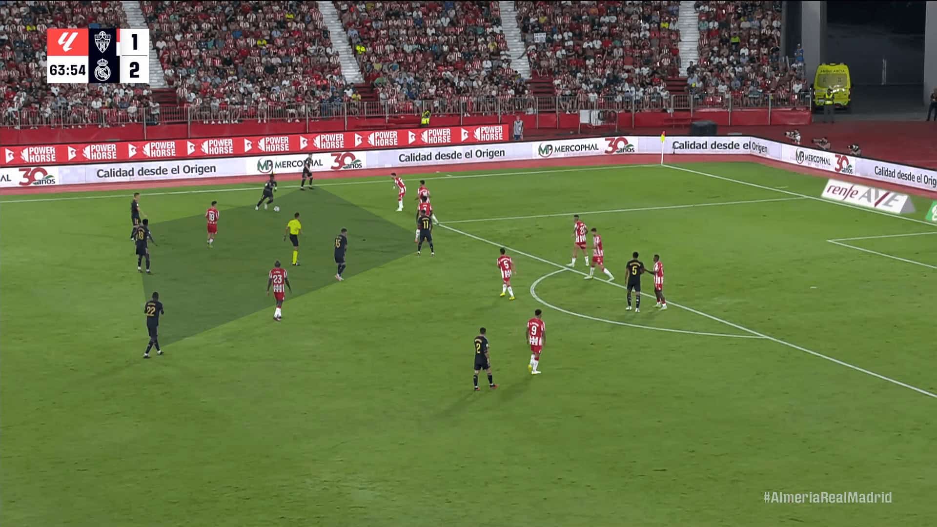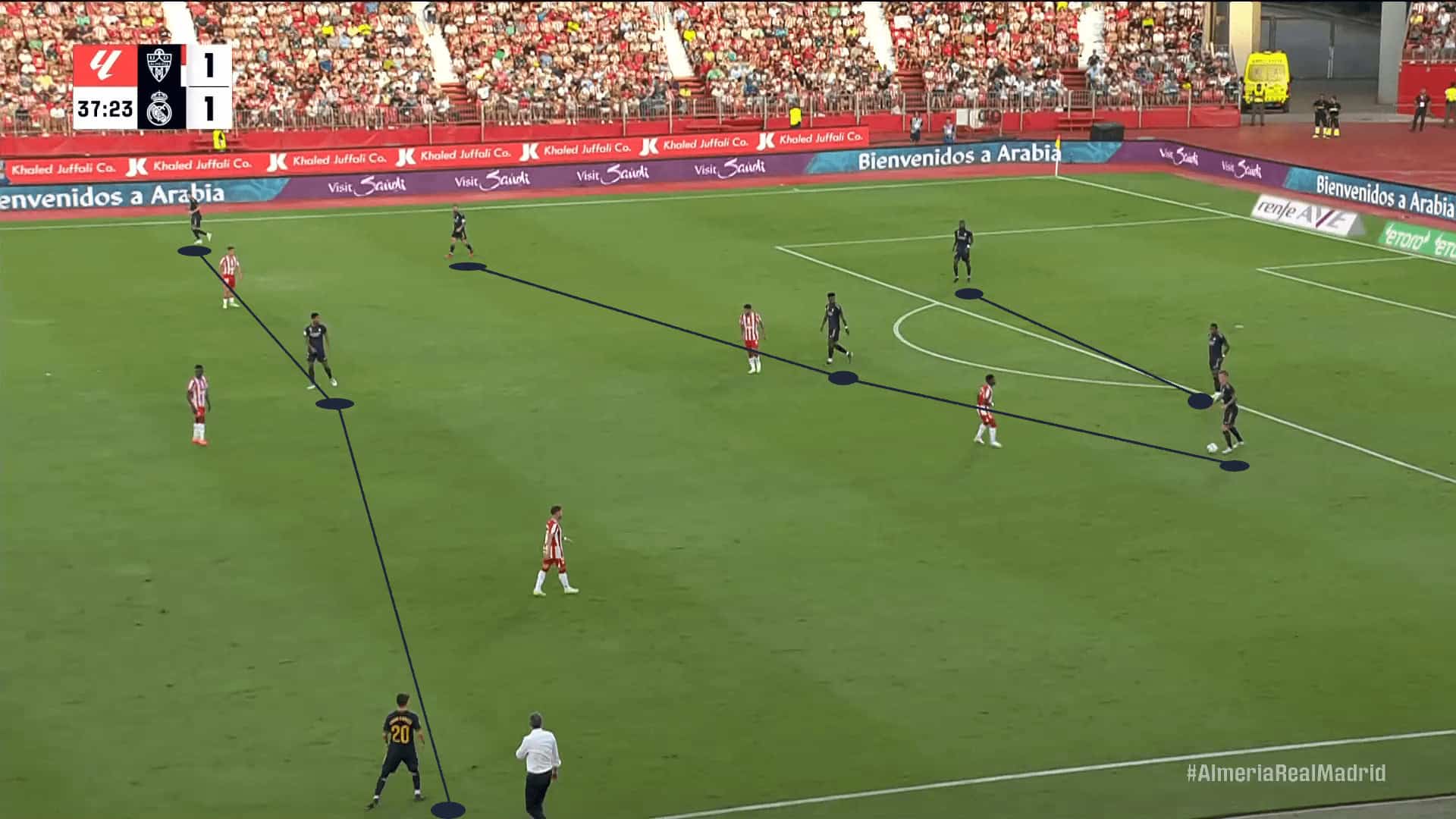 With the two forwards occupying all four members of the Real Madrid backline and Los Blancos midfield oscillated between a diamond shape and a flat three deep with Bellingham in front of them, Almería looked for pockets of space between the lines.