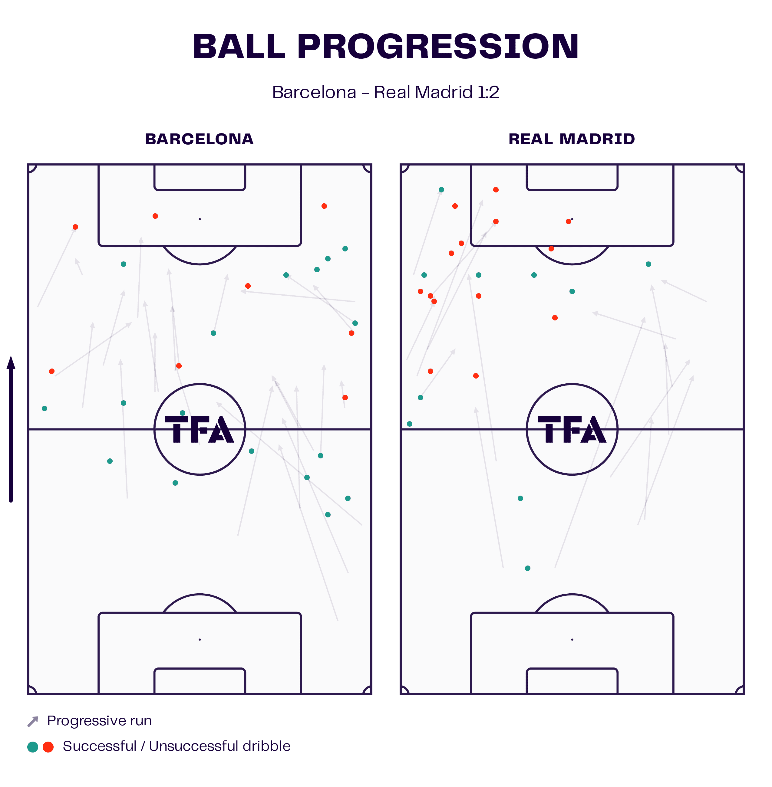 Comparing each side’s ball progression count, Barcelona had more success progressing on their right, which coincides with Real Madrid’s left. It was that side of the pitch that received most of the action and was pivotal to the outcome of the game. The red dots on Real Madrid’s progression map show the level of success Araújo enjoyed against Vinícius Júnior. Adding the attacking threats of Camavinga at left-back was a pivotal moment in the match.