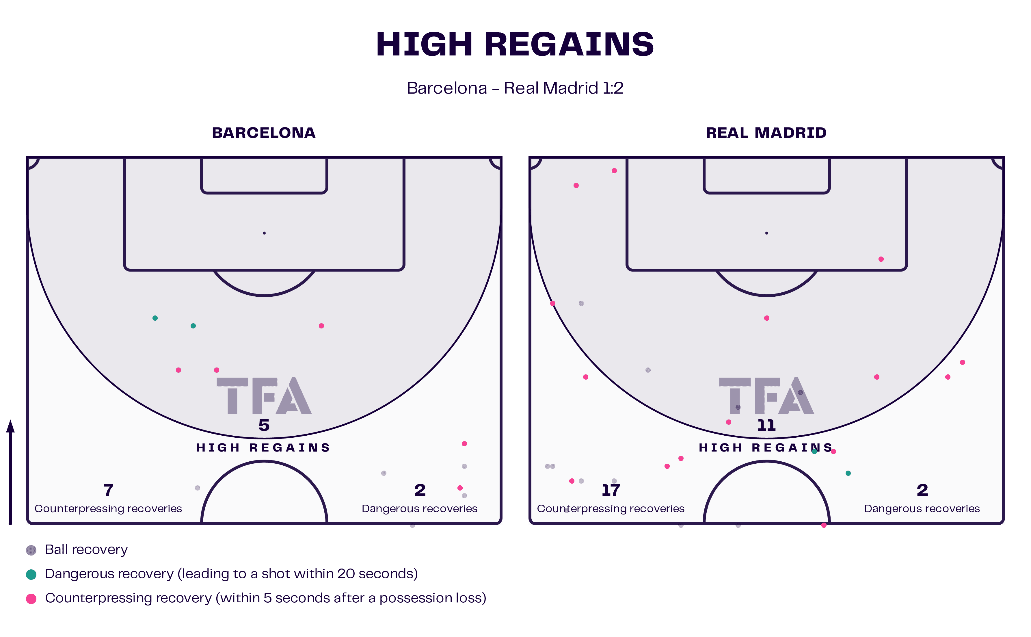 For the game, Real Madrid were the better of the two sides in terms of high regains, recording 11 to Barcelona’s five and 17 counterpressing recoveries in the attacking half of the pitch to Barcelona’s seven. Looking at the high regains map, Real Madrid’s recoveries were well-balanced in the attacking half. There isn’t one particular area that stands out, giving a sense that the particular tactics to funnel play into Christensen and earn recoveries from his mistakes didn’t quite come off.