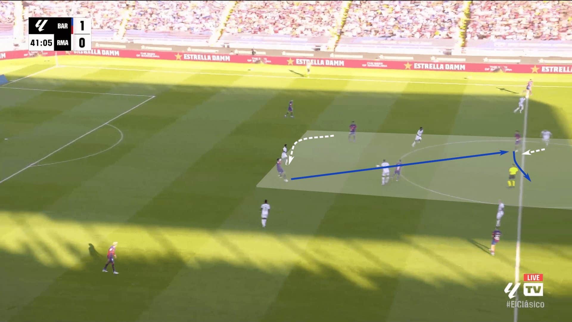 As seen below, the wide overloads unbalanced Real Madrid both horizontally and vertically. In the first half, Barcelona’s forwards did well to stretch the pitch vertically, offering runs in behind and disconnecting the Madrid backline from the midfield. When opportunities to play behind presented themselves, Barcelona took their chances.