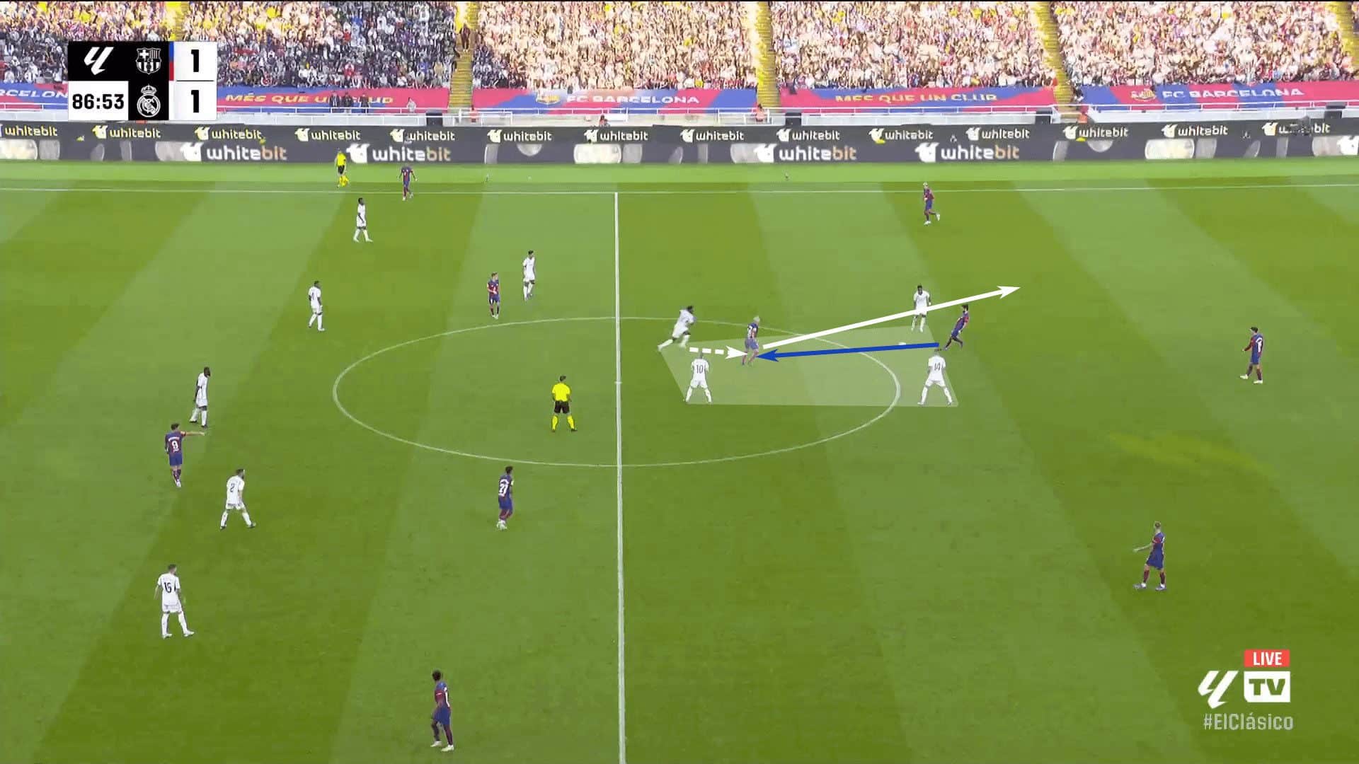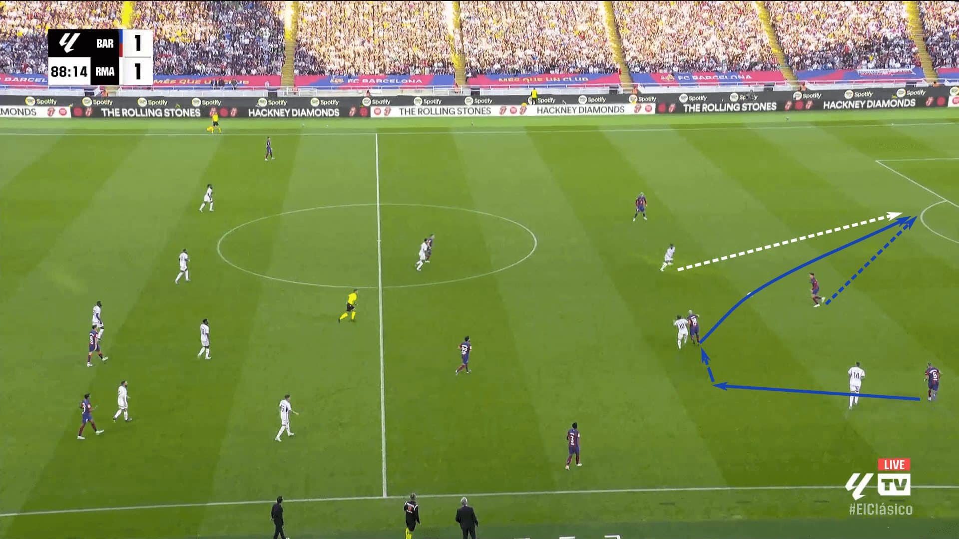Luka Modrić stepped on for Toni Kroos in the 63rd minute, accompanied by a swap of Joselu for Rodrygo, pushing Valverde to right forward. That move allowed Real Madrid’s front three to occupy all four members of Barcelona’s backline, creating more space for others to attack, especially Camavinga and Bellingham.