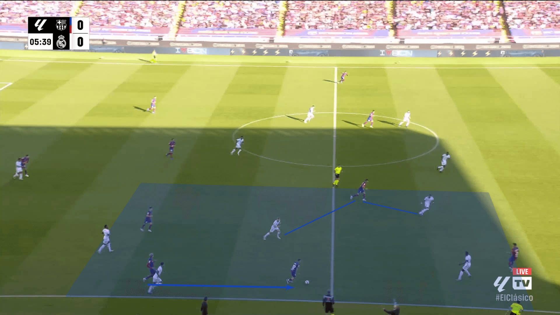 They were highly effective playing from the back, routinely beating a Real Madrid high press that targeted Christensen. Once Barcelona were able to beat the first line of the Madrid press, they were very effective in creating wide overloads. In classic Barcelona fashion, they showed press resistance in small groups to retain possession and force Real Madrid to become unbalanced near the ball.