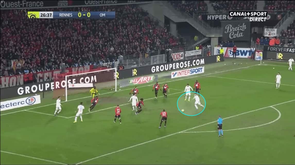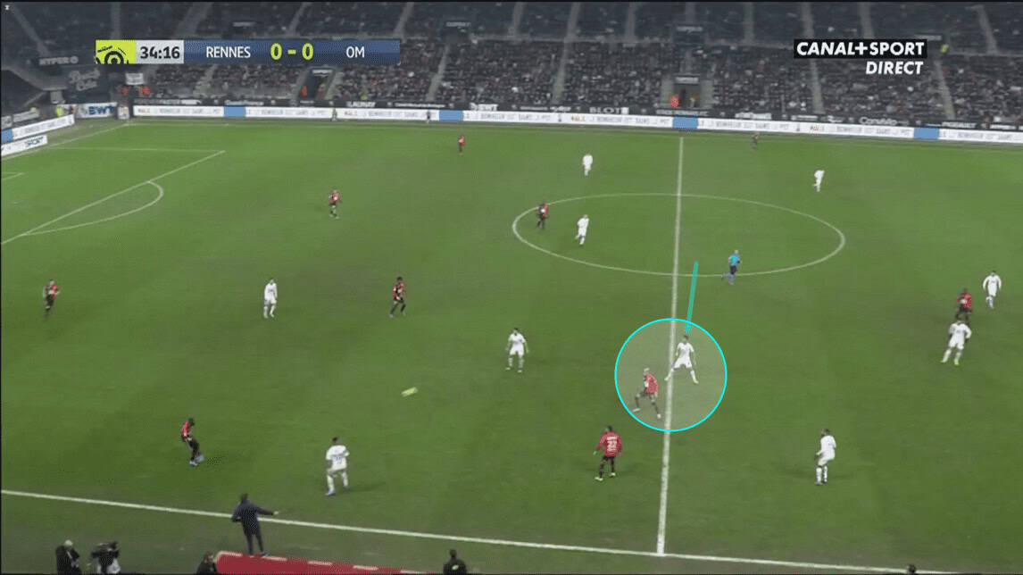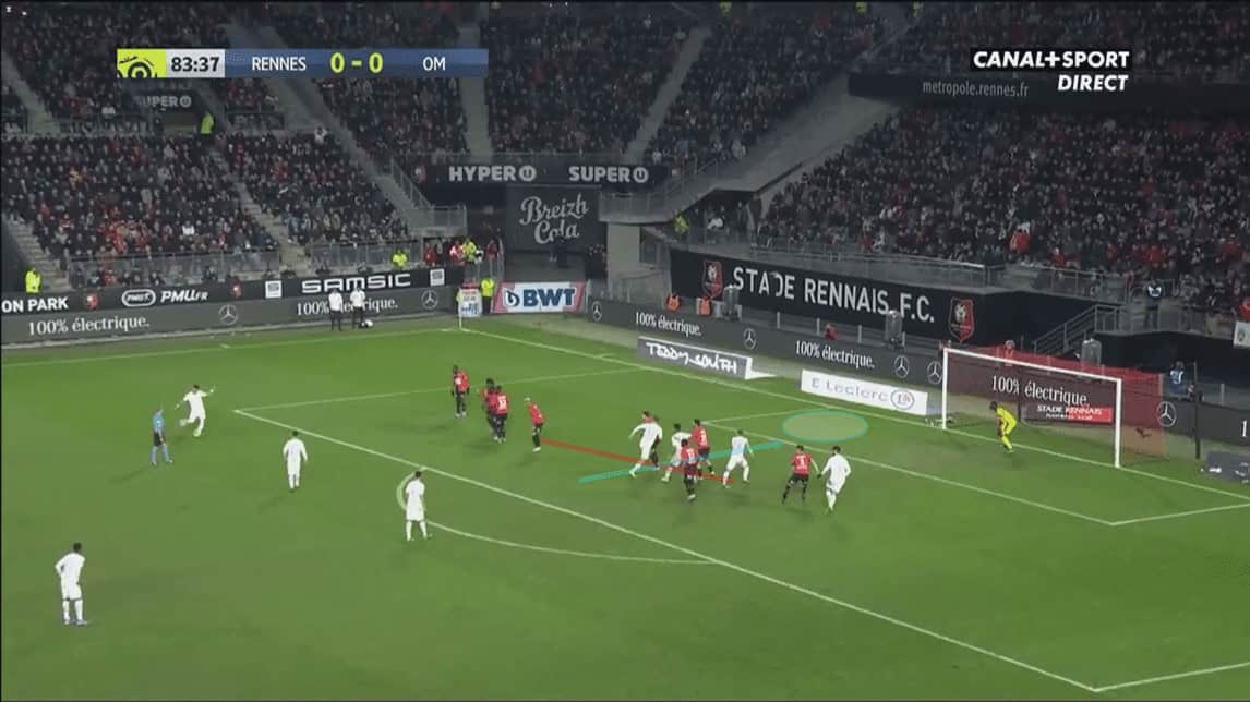 We can see that this allows space at Marseille’s left-wing for Sanson to probe into once again. However, Sanson doesn’t receive the ball on this occasion as Rennes force Marseille to restart by giving away a free-kick, in a non-dangerous position.