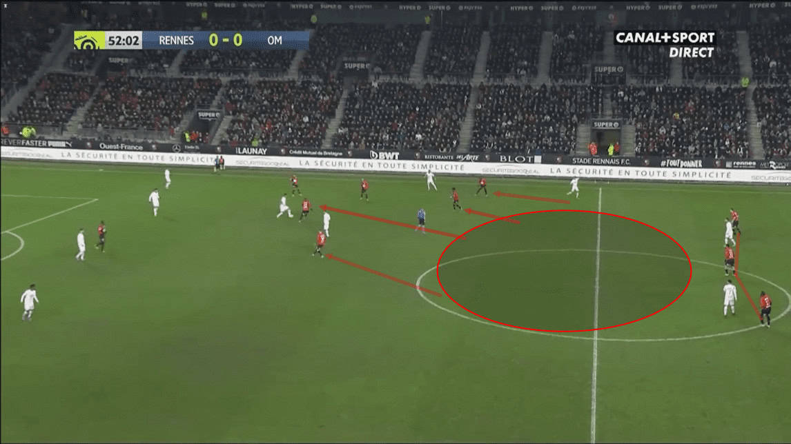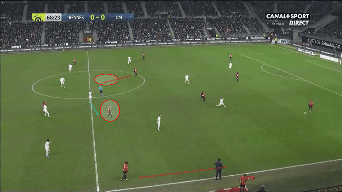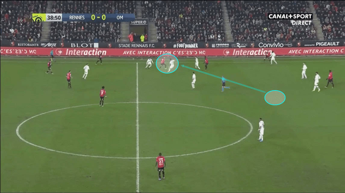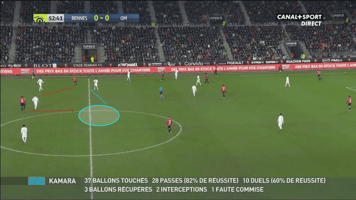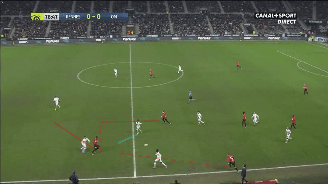 Rennes’ tactical alterations were evident from the very beginning of the second half. They intended to drag Kamara out of position by attracting him away from the centre with one player, while another player would then move into the central space between the lines to create.